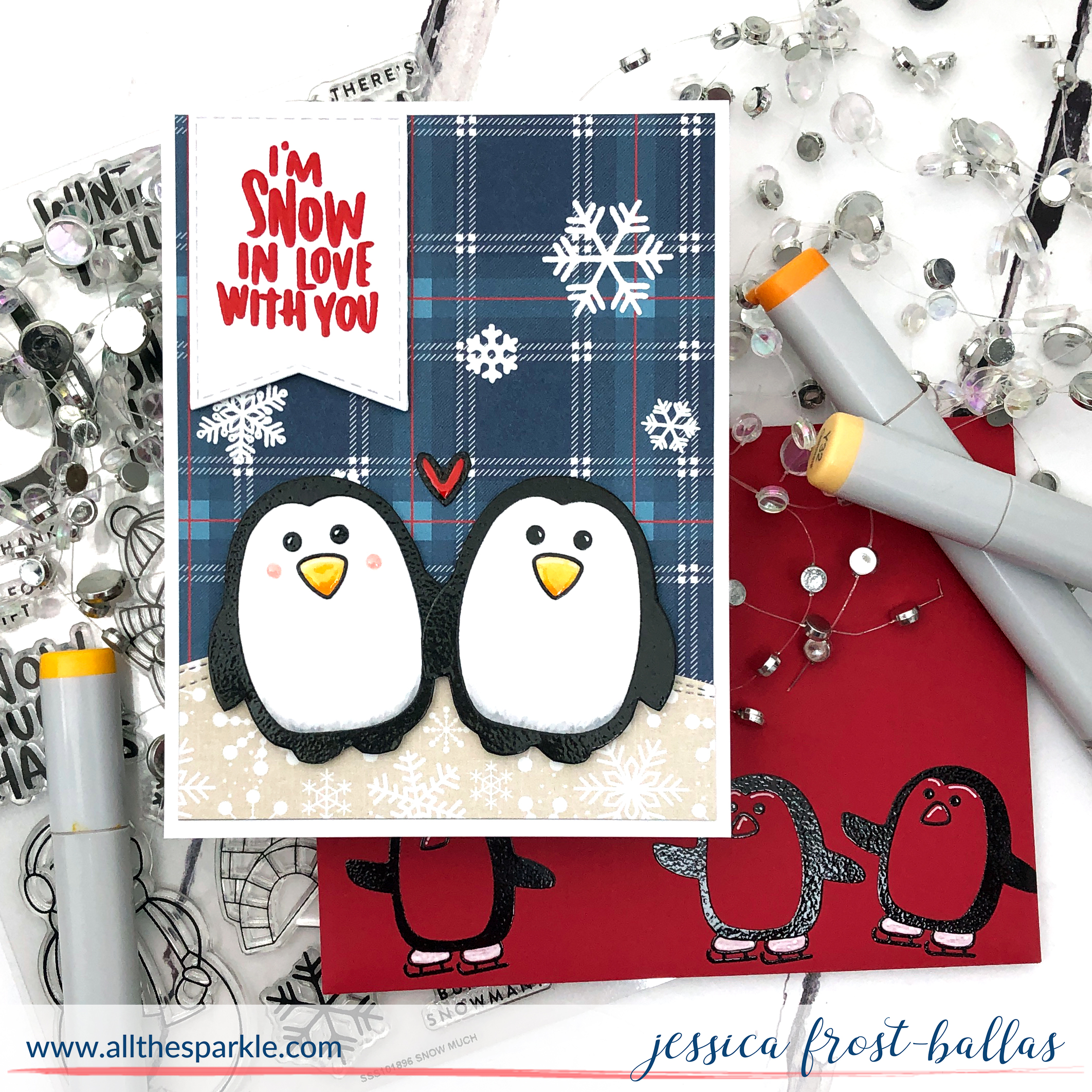 Next I layered the pattern paper to create a snowy night sky. I heat-embossed a few snowflakes onto the blue plaid paper with white embossing powder. I used the Drifting Stitches border die to die-cut the ground for my penguins. Then I layered them onto a white card base and used foam mounting tape to adhere my penguins and liquid adhesive for my heart. I stamped the sentiment onto a stitched banner and heat-embossed it with red embossing powder. Finally I added a little nuvo crystal glaze to the penguin’s beaks and the heart to finish the card!