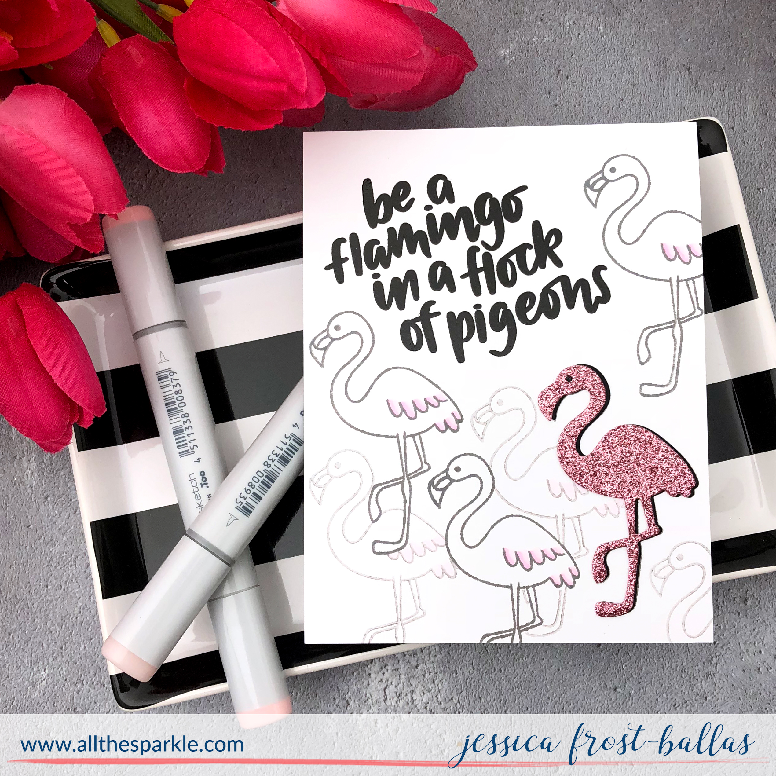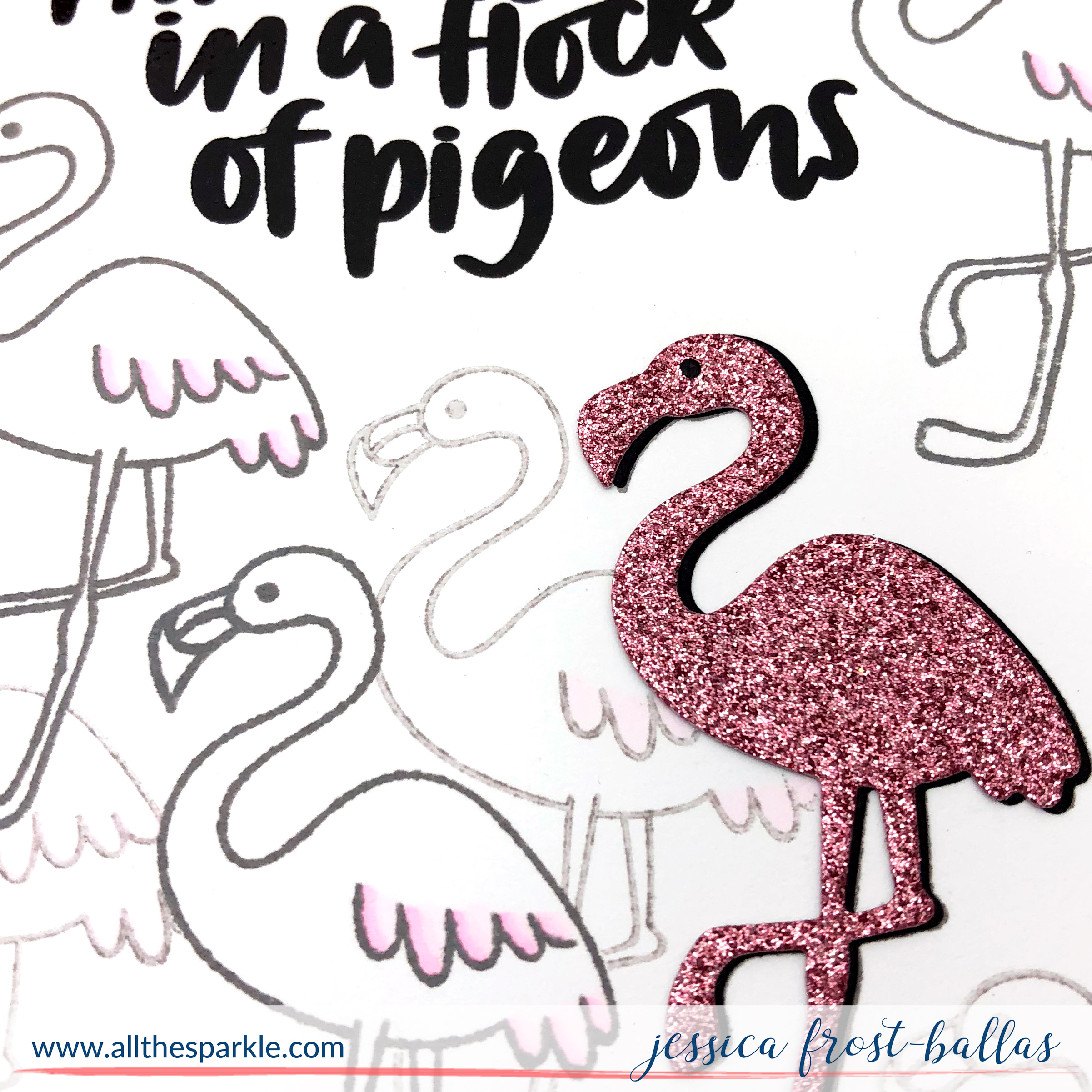 I guess technically my glittery pink flamingo is in a flock of boring flamingos (not pigeons)…but you get the idea! 😉 I definitely wanted a glittery pink flamingo to take center stage for my card! 😉 I started by stamping the sentiment with versafine and heat-embossed it with clear embossing powder. Next I created several masks of the flamingos by stamping them on post-its and cutting them out. I stamped several of the flamingos using slate ink. For some of the flamingos I used a second generation stamping to get the lighter impression. Then I added a touch of copic coloring to their wings and tails.