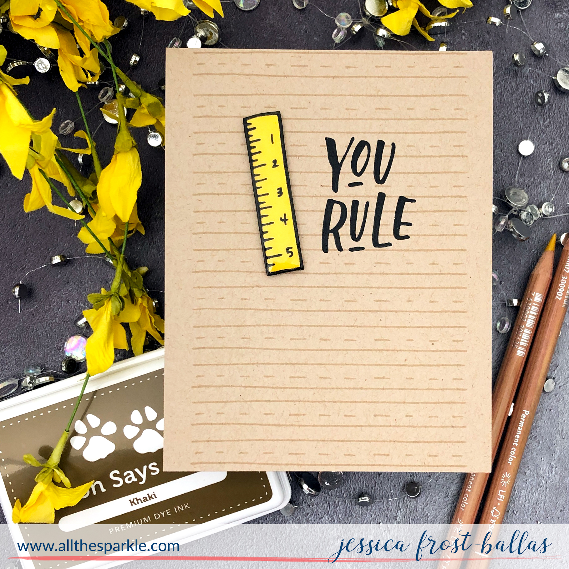 Next up is a fun and easy card and gift that is perfect for a teacher or student in your life! I started by stamping the cute ruler from School Days onto white cardstock with versafine and heat-embossed it with clear embossing powder. I colored it with copics and then fussy cut it. Then I placed the ruled lines stamp on my MISTI and stamped it onto kraft cardstock with khaki ink. I moved the card panel up inside my MISTI and stamped again to get a repeating pattern. I kept doing this until the entire panel was covered with this pattern. Then I simply stamped the sentiment with versafine, heat-embossed it with clear embossing powder, and adhered the ruler with foam mounting tape. To finish the card I added a thin layer of crystal glaze to the ruler and let it dry overnight!