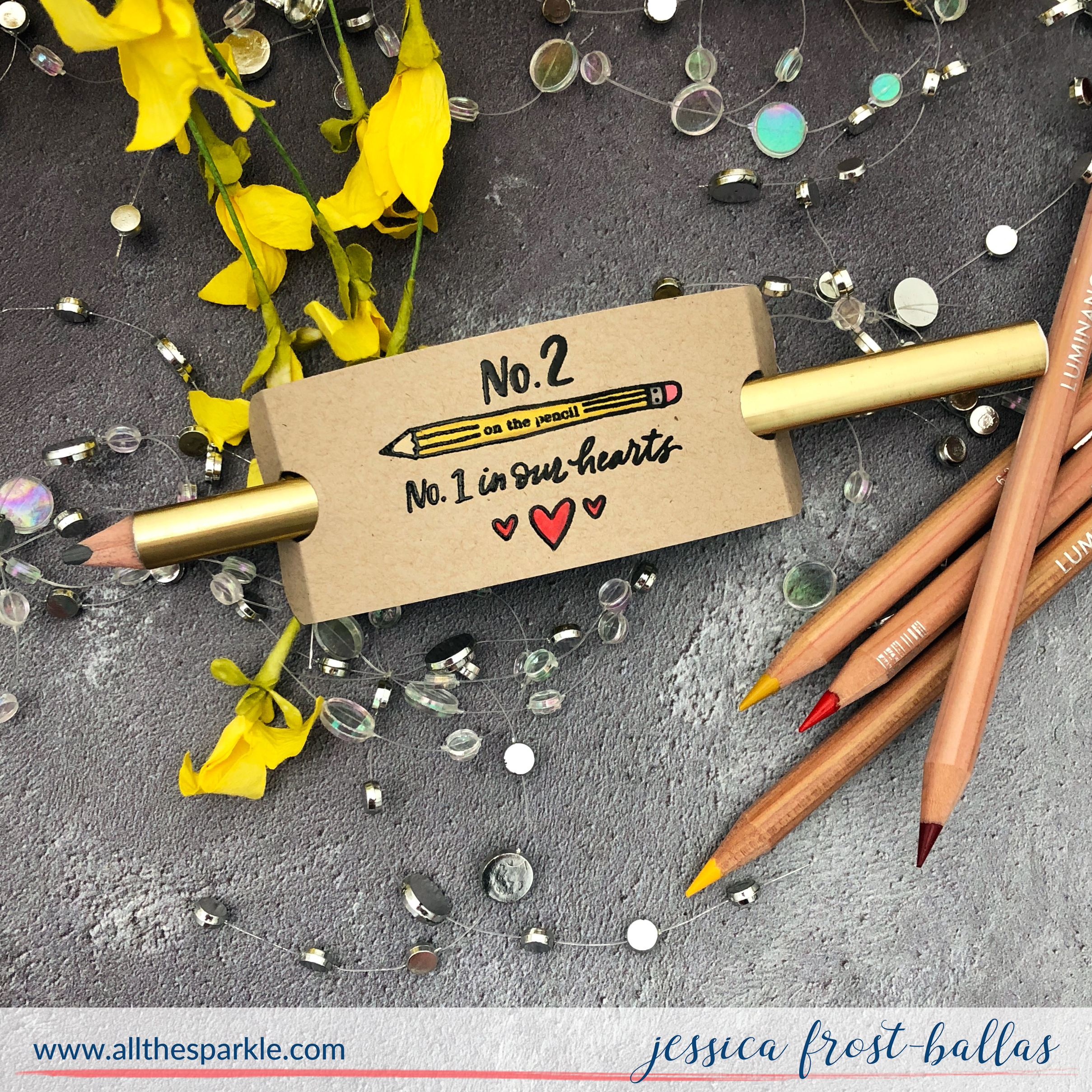 My next little project is a pencil holder! I started by taking a piece of kraft cardstock cut to 2.5″ by 5″ and stamped the pencil sentiment with no line ink in my MISTI. I colored it with my luminance pencils and then placed the cardstock back inside my MISTI and restamped. This time I stamped with versafine and heat-embossed it with clear embossing powder to get that great contrast! I scored a half inch from both ends and rounded them with a corner chomper. Then I die-cut a small circle from both ends, centering the circle over the scored line. You could use a hole punch for this step if you’ve got one large enough to fit a pencil! This particular pencil is a big, oversized triangular shape so the circle dies worked best but depending on what you’re using a punch would work, too! Then I simply slid my pencil into the holes and that’s it! You could play with the sizing and include a small memo pad behind the tag or wrap it around a box of colored pencils instead of adding pencil holes! Lots of fun ways to creatively present some school essentials! 🙂