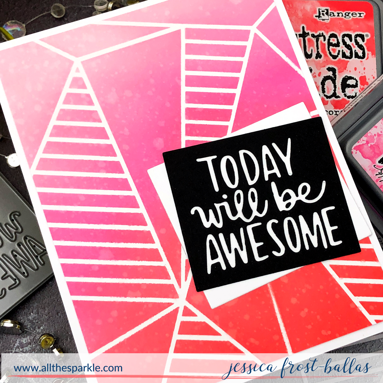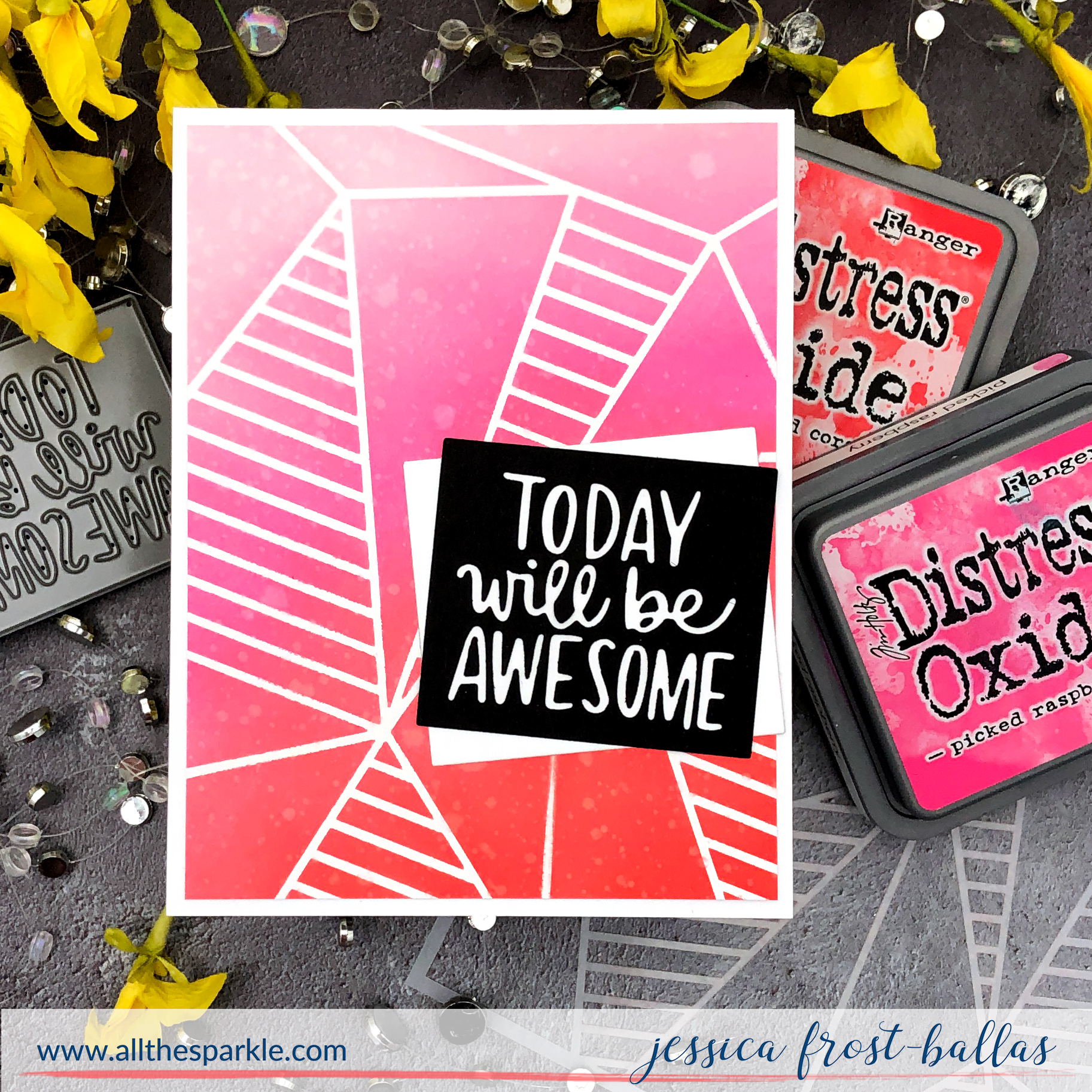 I just love stenciling with oxides…they just blend so easily! I started by spritzing the back of the Faceted Stripes stencil with pixie adhesive spray. I let it dry for few minutes and then placed it over a piece of strathmore bristol cardstock. The adhesive spray really holds nicely to the paper and doesn’t damage the paper when you remove it! I blended spun sugar, picked raspberry, abandoned coral, and candied apple distress oxide ink over the stencil and then spritzed it with water and shimmer spray.
