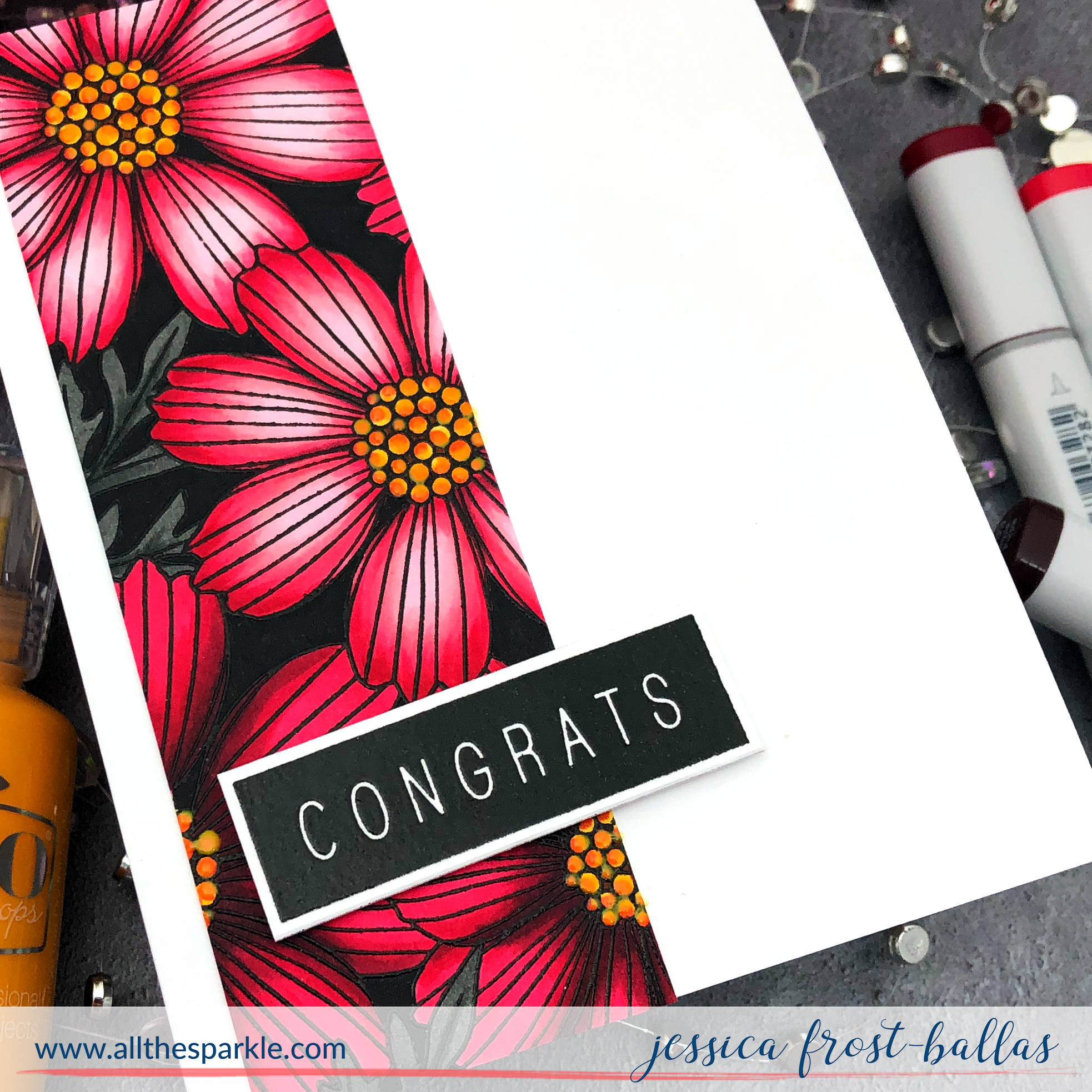 I have to start with this gorgeous cosmos background! Cosmos are one of my absolute favorite summer flowers so I was thrilled to see it get this fun background stamp feature! You’ll have to come back tomorrow to see what I did with the majority of the panel 😉 but I had enough left over to get a second card! I stamped the Cosmos Background with barely beige no-line ink using my MISTI and left the stamp inside my MISTI. Then I colored it with copic markers. I used RV06, R29, RV21, RV25, RV29, R39, and RV99 for the flowers, Y35, Y38, and YR16 for the flower centers, T5 and T7 for the foliage, and 110 for the background. Once I finished coloring I placed the panel back inside my MISTI, stamped it again with versafine and heat-embossed it with clear embossing powder to really bring out the contrast between the pinks and blacks!