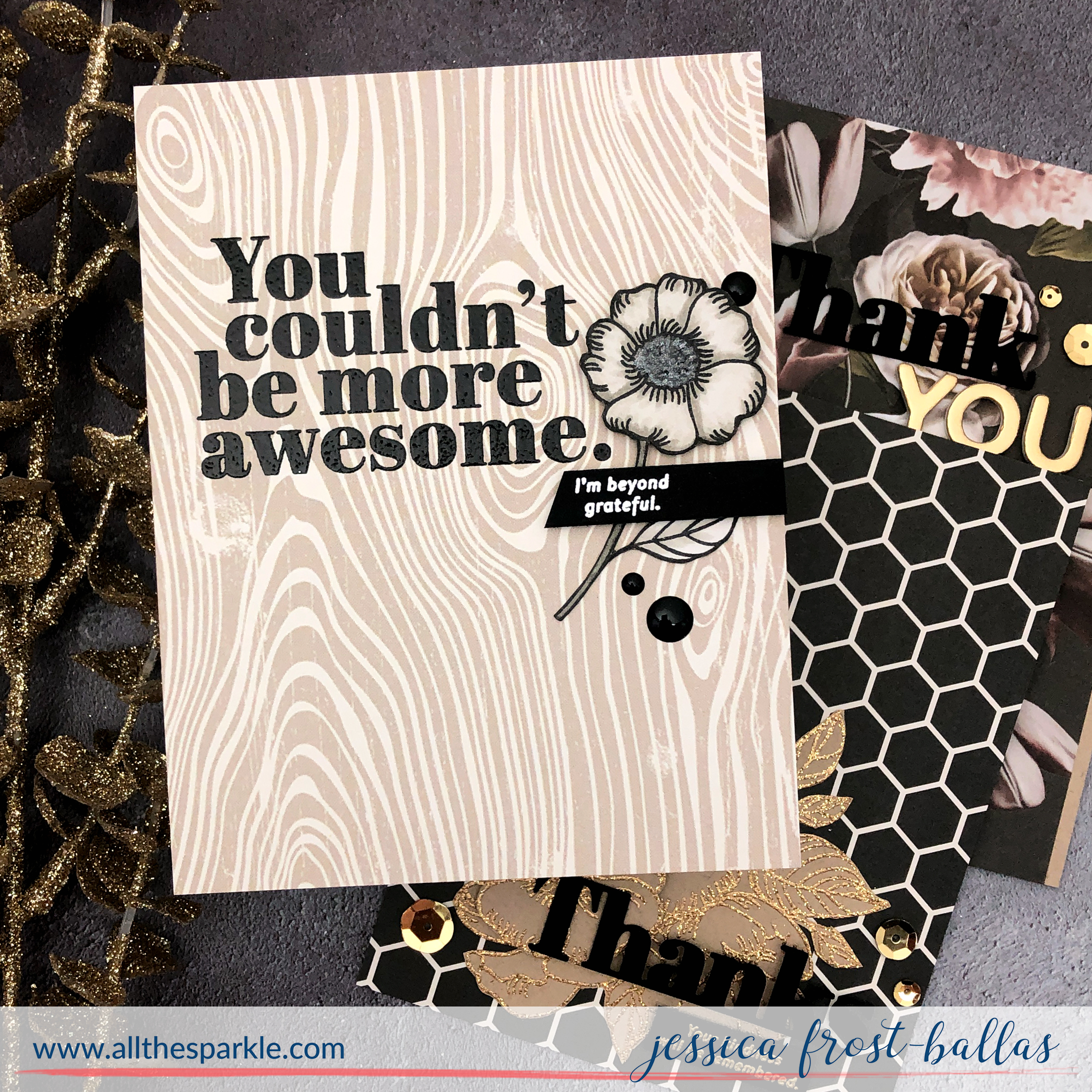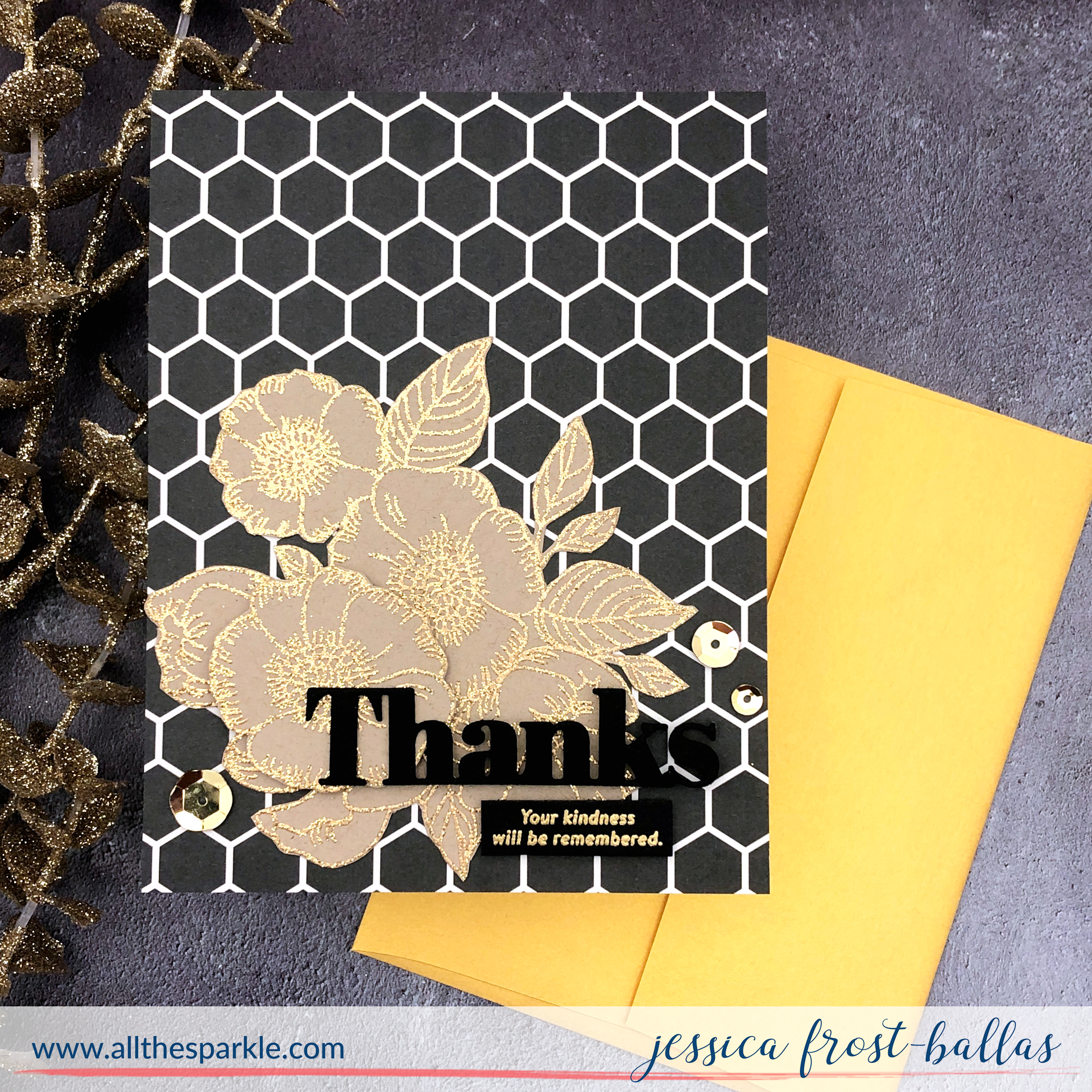 My final card continues to take advantage of the fun papers included in the kit! I adhered that honeycomb paper to a card base. Then I stamped the flowers onto kraft cardstock with versamark and heat-embossed them with gold glitter embossing powder before fussy cutting them. I layered them onto the patterned paper and adhered them with a mix of regular adhesive and foam mounting tape. Next I die-cut the Thanks from black cardstock three times and adhered them together. I adhered them over the flowers and added a heat-embossed sentiment banner below. Again I finished the card with a few gold sequins.