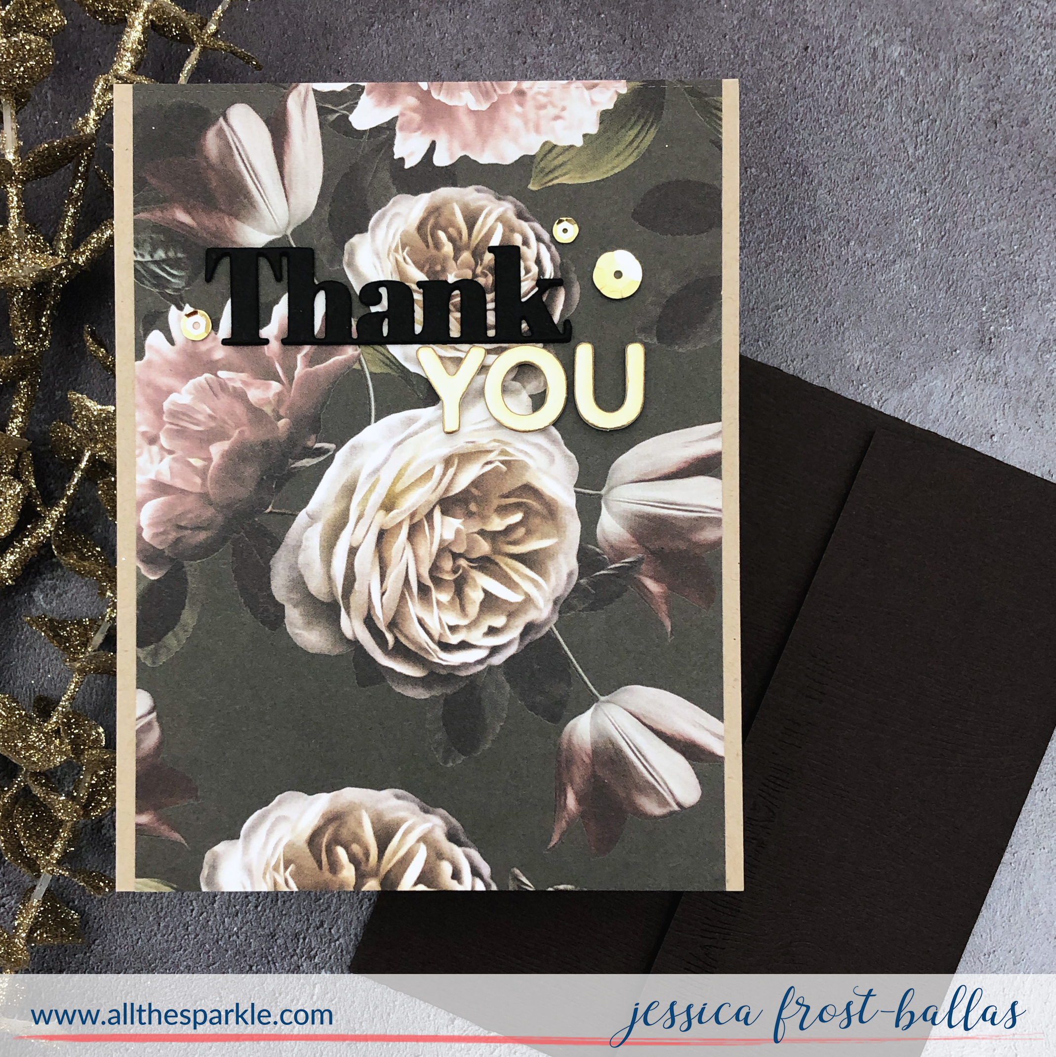 First of all, can we just appreciate the gorgeousness of this paper?! I loved it so much that I really didn’t want to cover it up much. So I just trimmed it down to 5.5″ by 4″ and adhered it to a kraft A2 panel. Then I die-cut the Thanks word die three times from black cardstock and layered them together. I adhered it to the card and then added the gold foam letter stickers to complete my sentiment. I finished the card with just a few gold sequins!