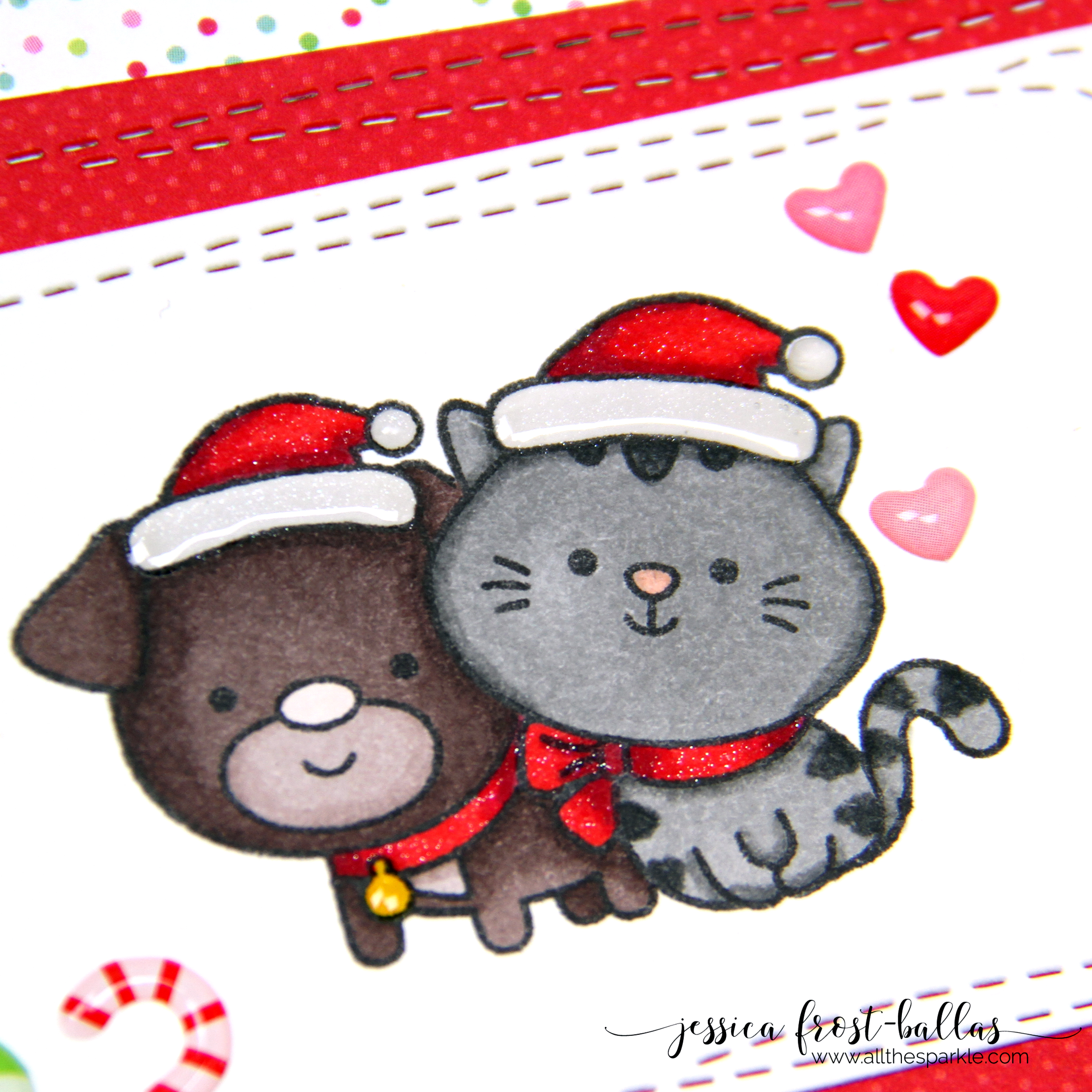The stamp set contains really cute sentiments and that adorable kitty and pup! I masked the images so I could stamp them together (though you’d NEVER find my cat and dog that close to each other…ha) and then colored them with copic markers. I die-cut the panel with the Wonky Rectangle dies and then die-cut several of the included patterned papers with the larger sizes of the Wonky Rectangle dies.