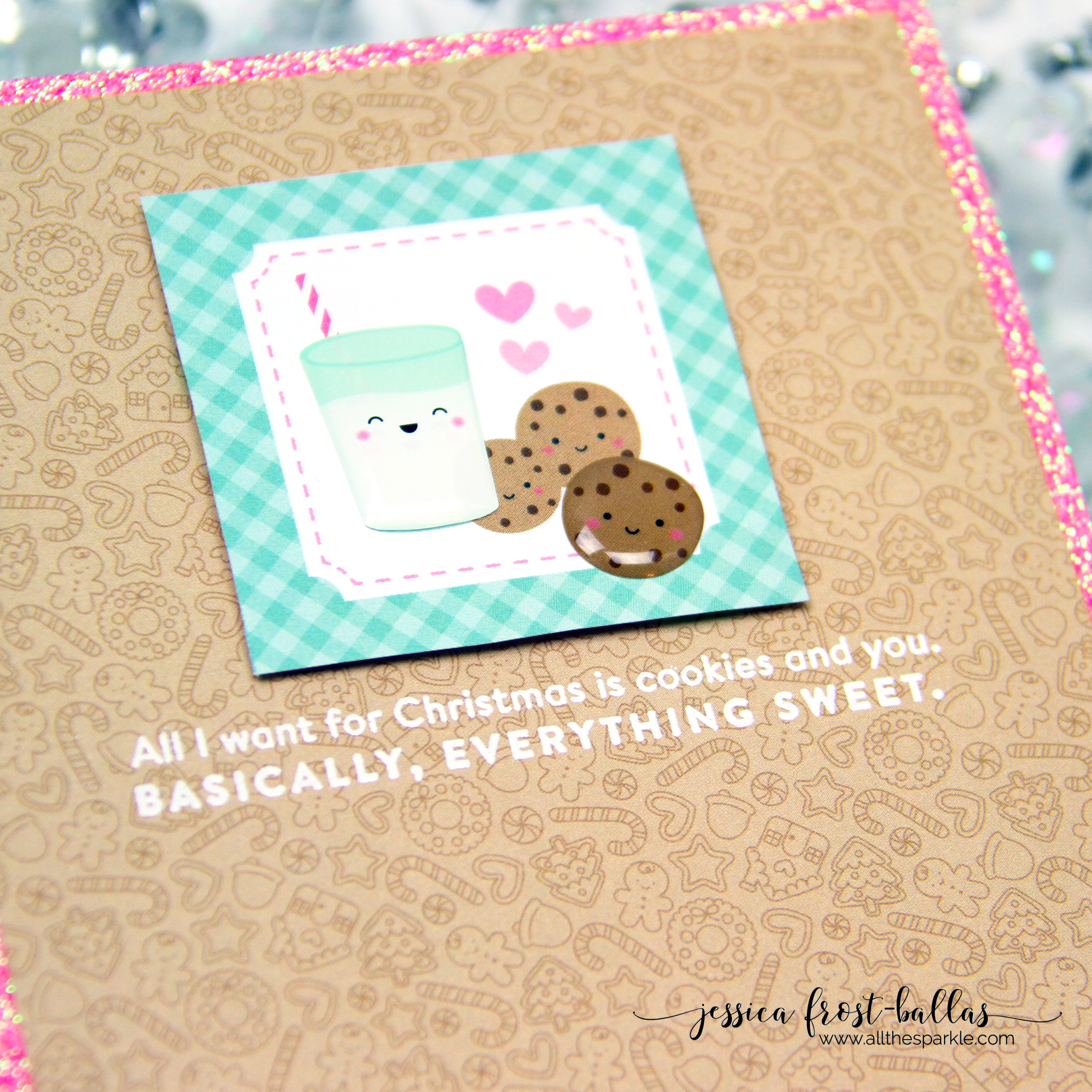 The kit has some gorgeous glitter papers and the pink was the perfect card base for my card. I stamped the sentiment on another patterned paper and then added the adorable milk and cookies square with foam mounting tape!