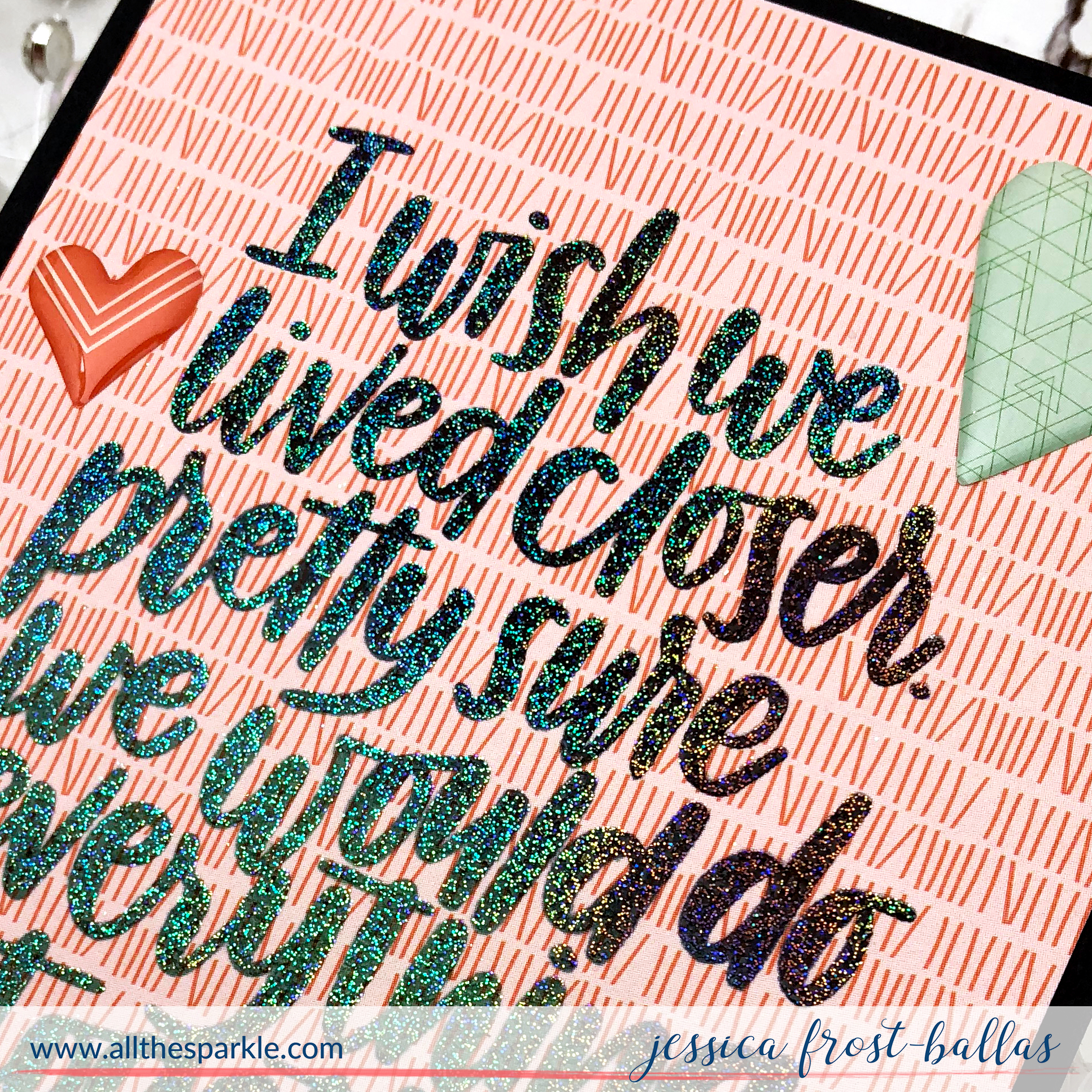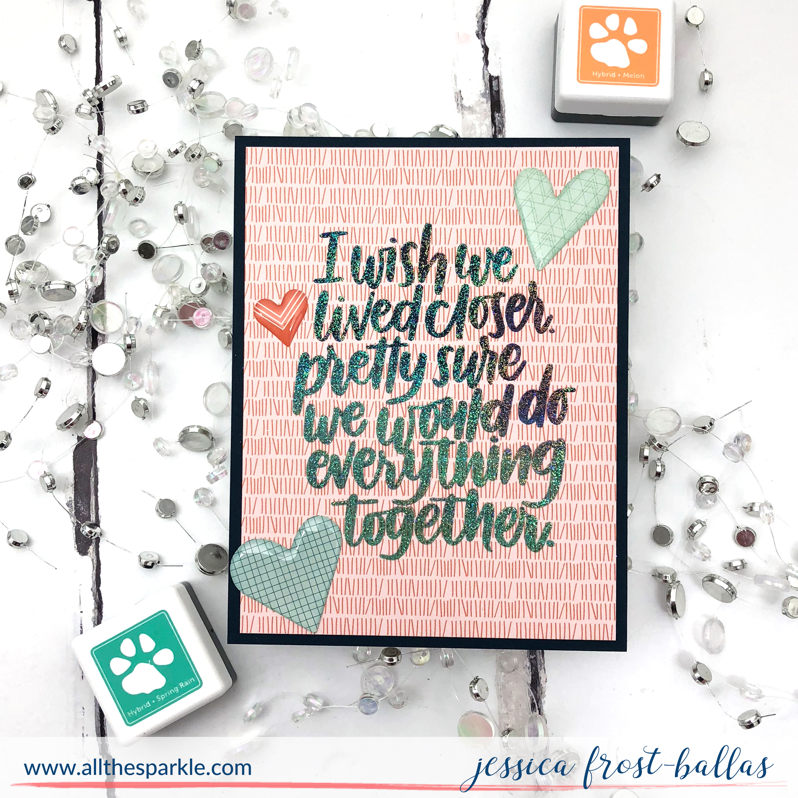 Isn’t that sentiment cute? I started by inking the bottom of this stamp with the included spring rain hybrid ink pad and the top of the stamp with a navy ink pad. I stamped it twice onto one of the included patterned papers using the MISTI so I could get nice even coverage. Then I inked the stamp with versamark and stamped the sentiment again. I heat-embossed it with hologram clear sparkle embossing powder which really picks up the teal and navy blue colors!