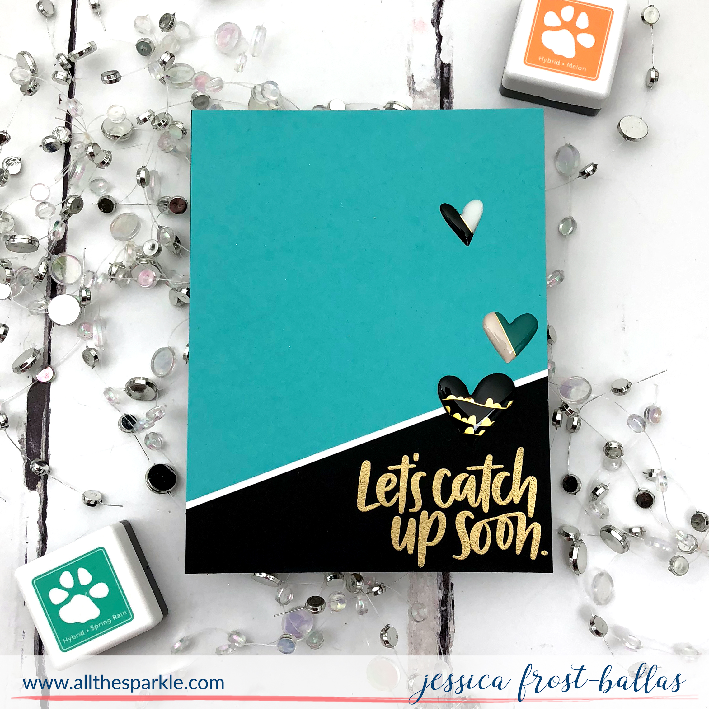 My next card used some of the heart stickers for inspiration. I trimmed the audrey blue cardstock and white cardstock included in the kit on a diagonal and adhered it over a piece of black cardstock. I stamped the sentiment and heat-embossed it with gold embossing powder and then used those stickers for a little extra sparkle and shine. It’s hard to see in the photos but the top two stickers have a gold diagonal line dividing the two colors.