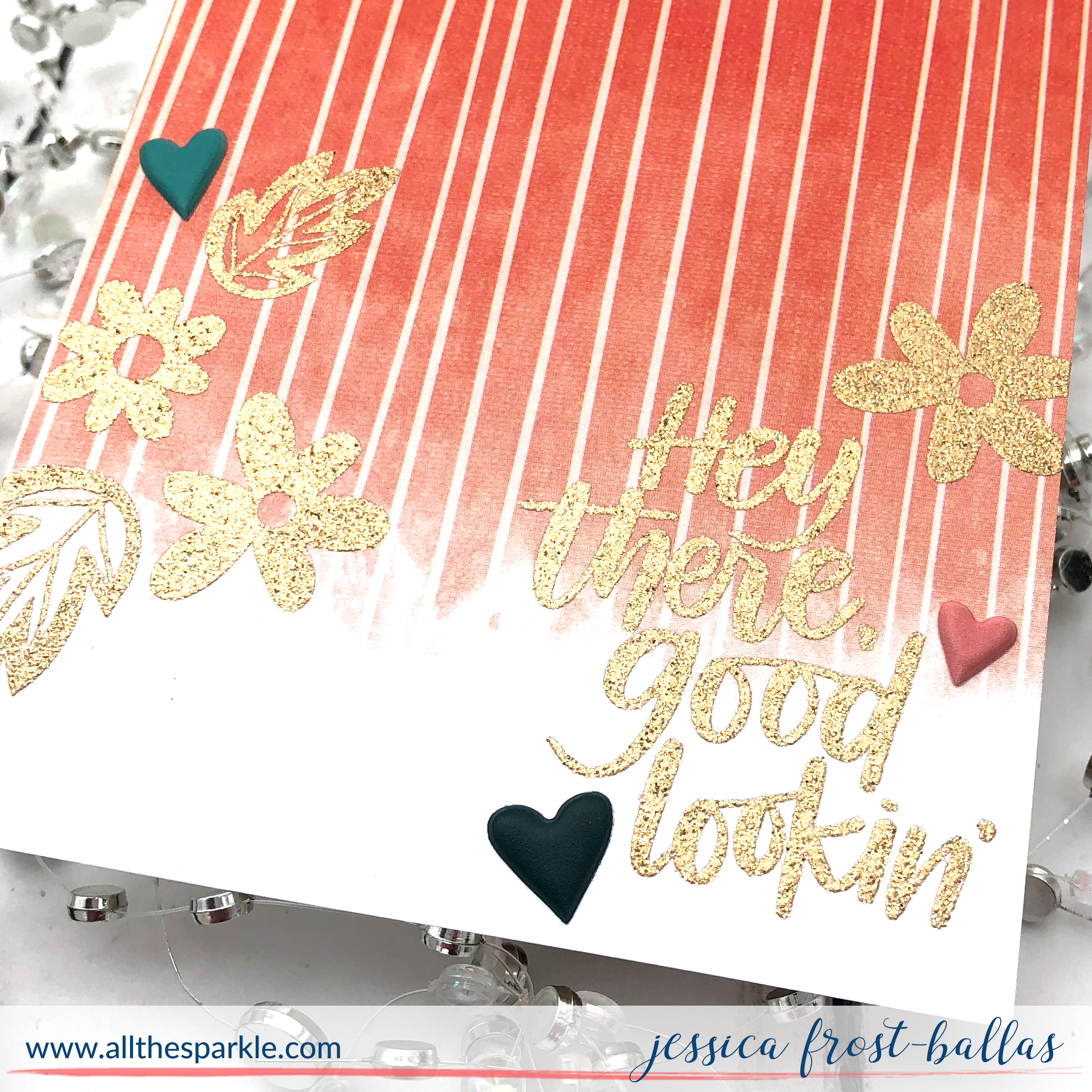 For the next card I stamped the sentiment and some of the flowers from the kit onto another piece of patterned paper and heat-embossed them with gold tinsel embossing powder. I added a few puffy heart stickers just for a little pop of color. I tilted the above photo so that the sentiment wouldn’t reflect the light but the embossing powder is the same for the top and bottom of the card…just looks a little different in the lighting.