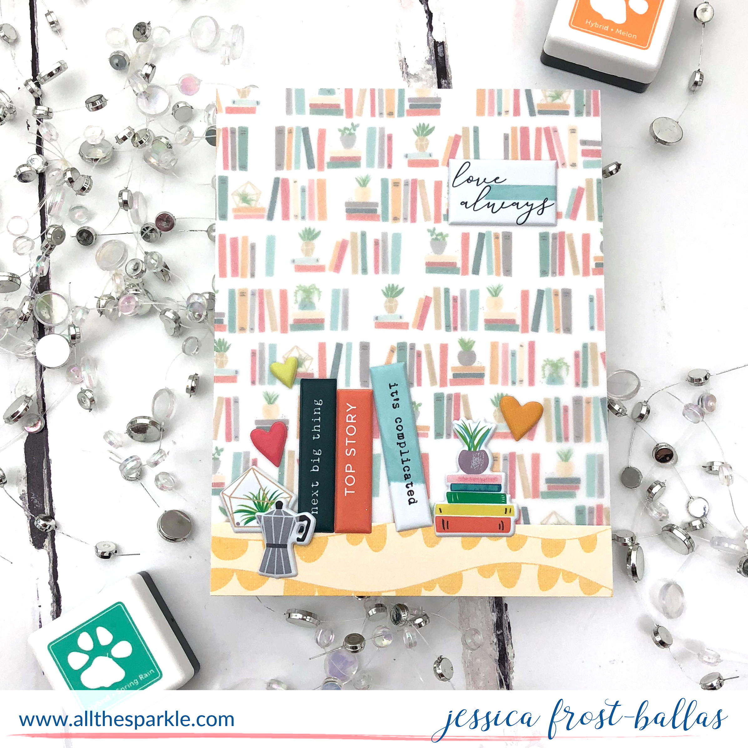 I created the look of a table or shelf and used those label stickers to create a row “books.” I love the little terrarium and the coffee pot. I toned down the background patterned paper by placing a piece of vellum over it and then finished the card off with a sticker sentiment!