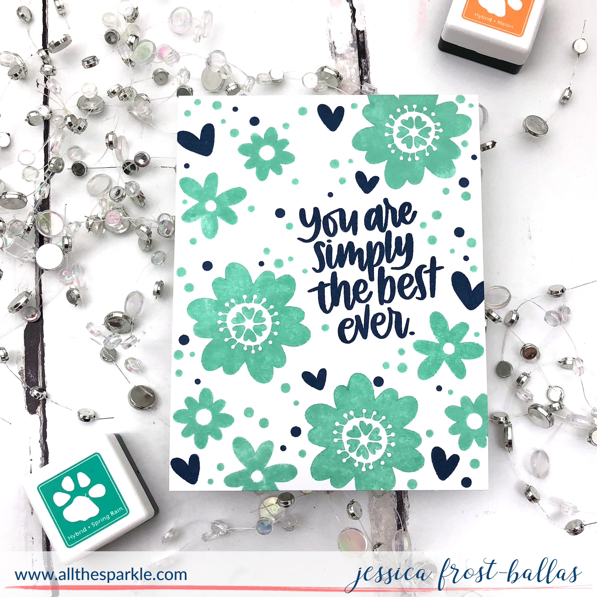 Next I went back to teal and navy for a simple stamped card. I started by stamping the sentiment and large flowers. Then I just filled in the smaller flowers and dots. I’d love to repeat this design with different color combinations!