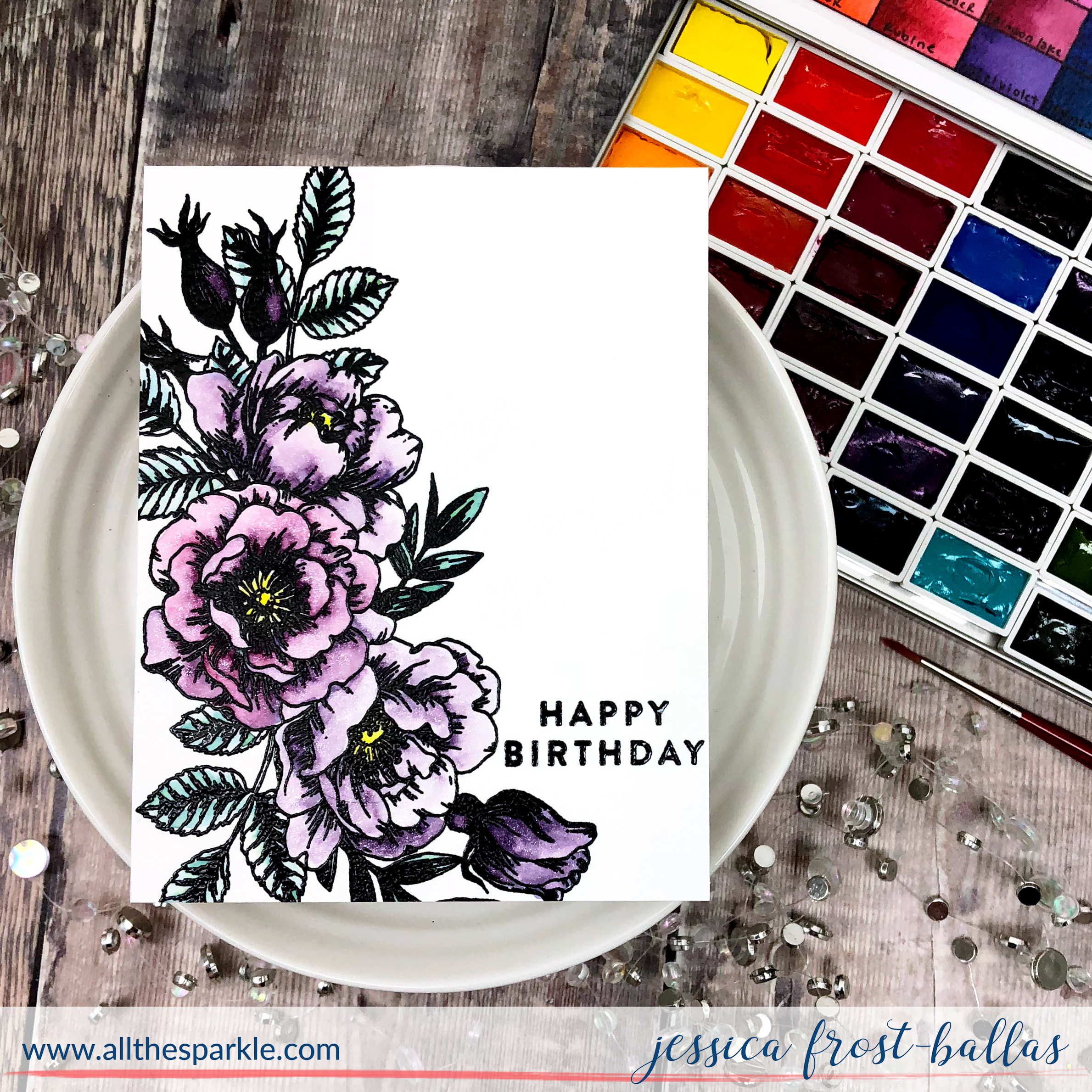 After I finished painting I let the flowers dry and then added a layer of spectrum noir clear sparkle for a little extra sparkle! I stamped the sentiment with versafine and heat-embossed it with clear embossing powder to finish the card.