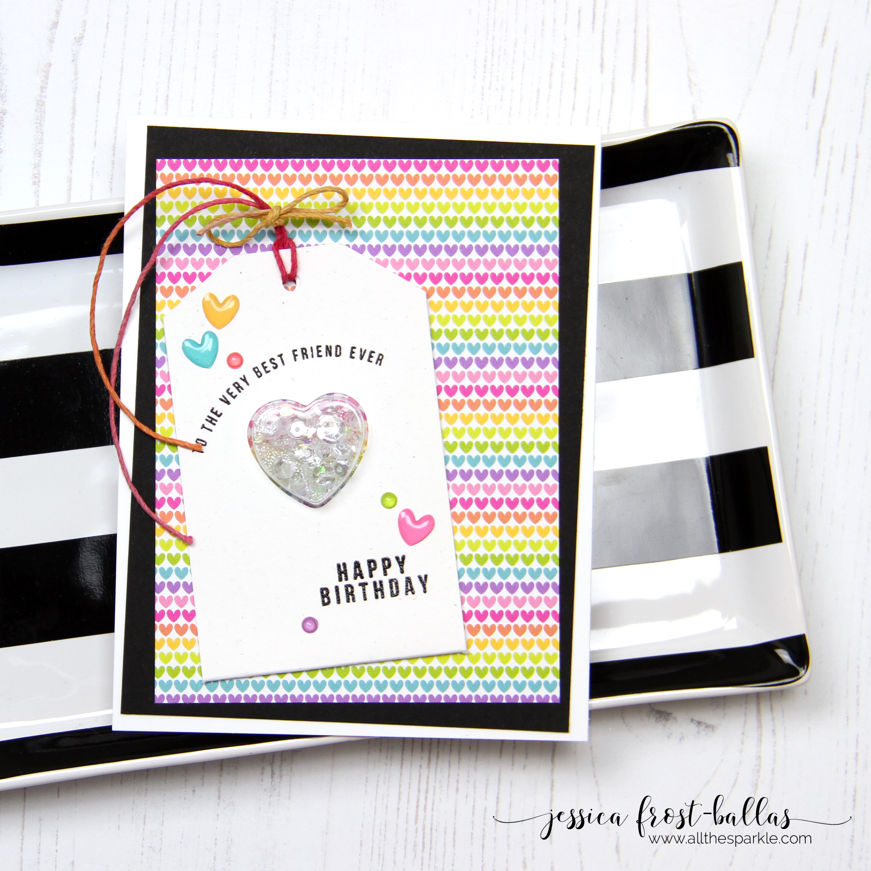 I love the bright and cheerful patterned papers and embellishments in this kit and thought it was perfect to include them in a kit with shaker tags! I trimmed down the patterned paper and layered it at an angle on a piece of black cardstock before adhering it to a white card base. I also trimmed down the sides of the tag to make it a little narrower. I stamped the sentiment with versafine and heat-embossed it with clear embossing powder. Then I added a strip of the patterned paper behind the heart opening in the tag. I filled the shaker with clear sequins, iridescent hearts, and tiny clear beads and sealed up the shaker. I adhered the tag to the background and added a little twine. Finally I added some of the hearts and dots from the kit to finish the card!