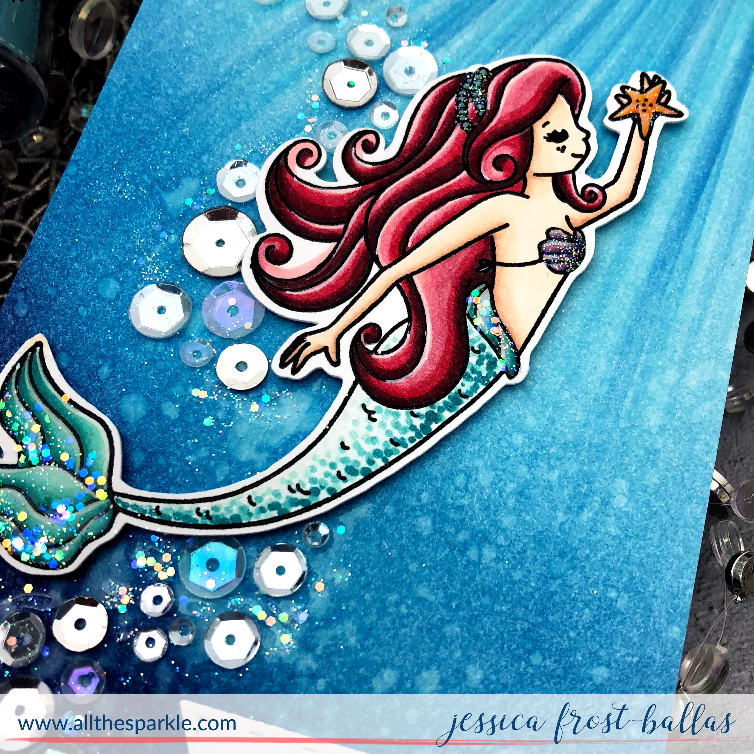 To create my background I started by blending chipped sapphire, mermaid lagoon, and tumbled glass distress ink onto a 4″ by 8″ panel of strathmore bristol cardstock. I spritzed it with water several times and blotted off the excess waters to create the appearance of bubbles! Next I took a few copic markers and drew rays descending from the top right corner of the panel. (One of these days I need to remember to just buy a sun ray stencil…oops). I also used colorless blender to lighten the rays as well. Then I trimmed down the panel to 3″ by 7″ and adhered it to a side-folding card base. Then I adhered my mermaid and sentiment with foam mounting tape. Next I arranged a mixture of sparkling clear, iridescent clear, and silver sequins of varying sizes in a vertical pattern across my card panel. I adhered them with nuvo crystal glaze and then carefully added a little extra glaze around my sequins following the same basic shape. I sprinkled the glaze with prisma and chunky glitter for a little extra sparkle. I love how the sequins add the illusion of movement to the card and of course, all the sparkle!!