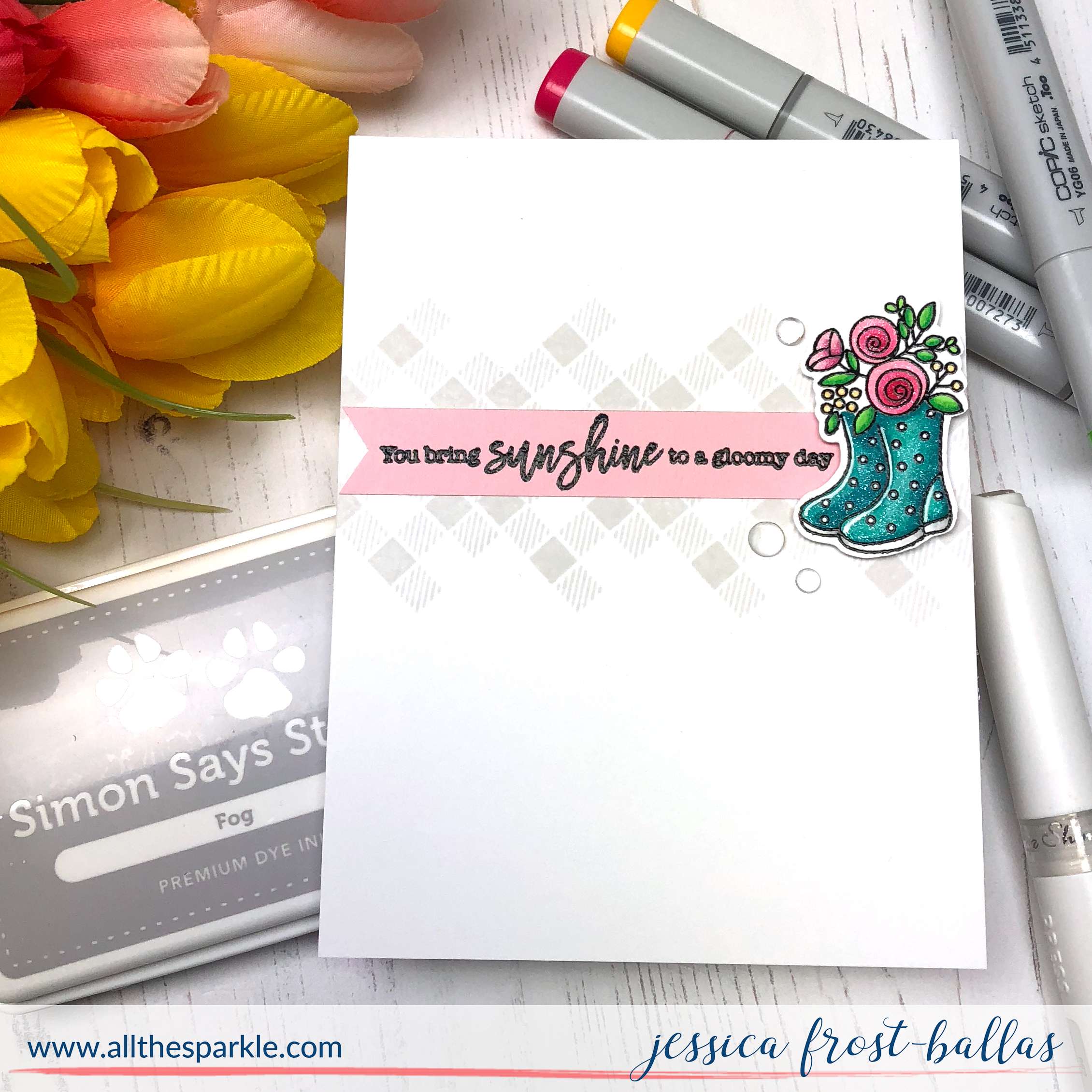 To start I arranged the plaid stamp on an angle on the lid of my MISTI and inked it with Simon Says Stamp Fog ink. I shifted the cardstock a few inches over and stamped it again to create a repeating pattern across my card panel. Next I stamped the cute rain boot bouquet with versafine and heat-embossed it with clear embossing powder. I colored it with copic markers and then added a layer of clear glitter gloss with the included nuvo aqua splash brush. I fussy cut the image and then added a few accents with a white gel pen. I stamped the sentiment onto the pink cardstock included in the kit and heat-embossed it with clear embossing powder.