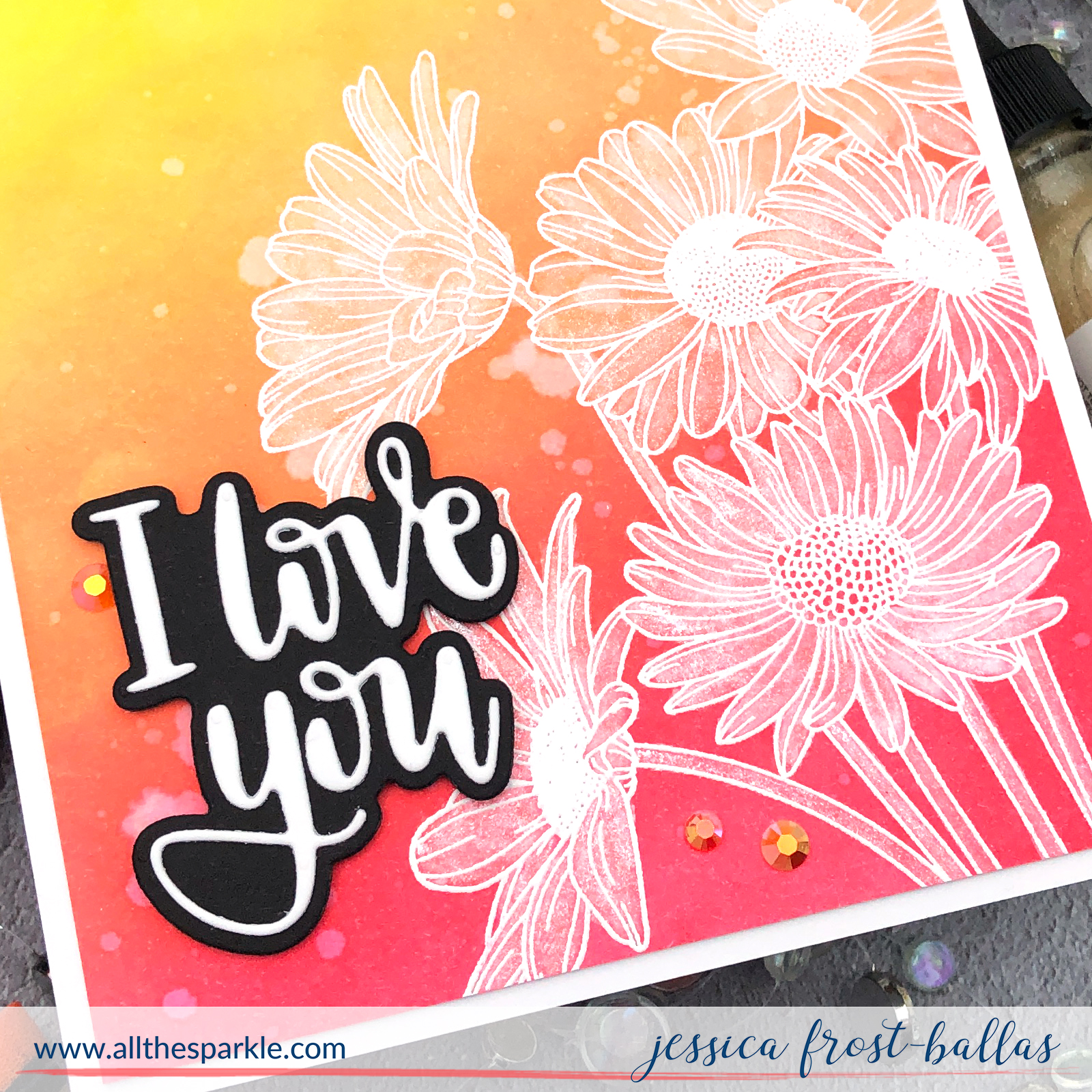 Once it was totally dry I stamped the Daisy Bouquet arrangement with versamark and heat-embossed it with white embossing powder. Then I mixed a tiny bit of white gouache with Ink on 3 Pixie Dust which is a super sparkly medium that can be mixed with paints and painted the flowers. It just gives a little interest to the flowers and adds a ton of sparkly goodness! I die-cut the I Love You sentiment with black and white cardstock and adhered it to the panel. I adhered that panel to a white card base and finished the card with a few sparkly gems!