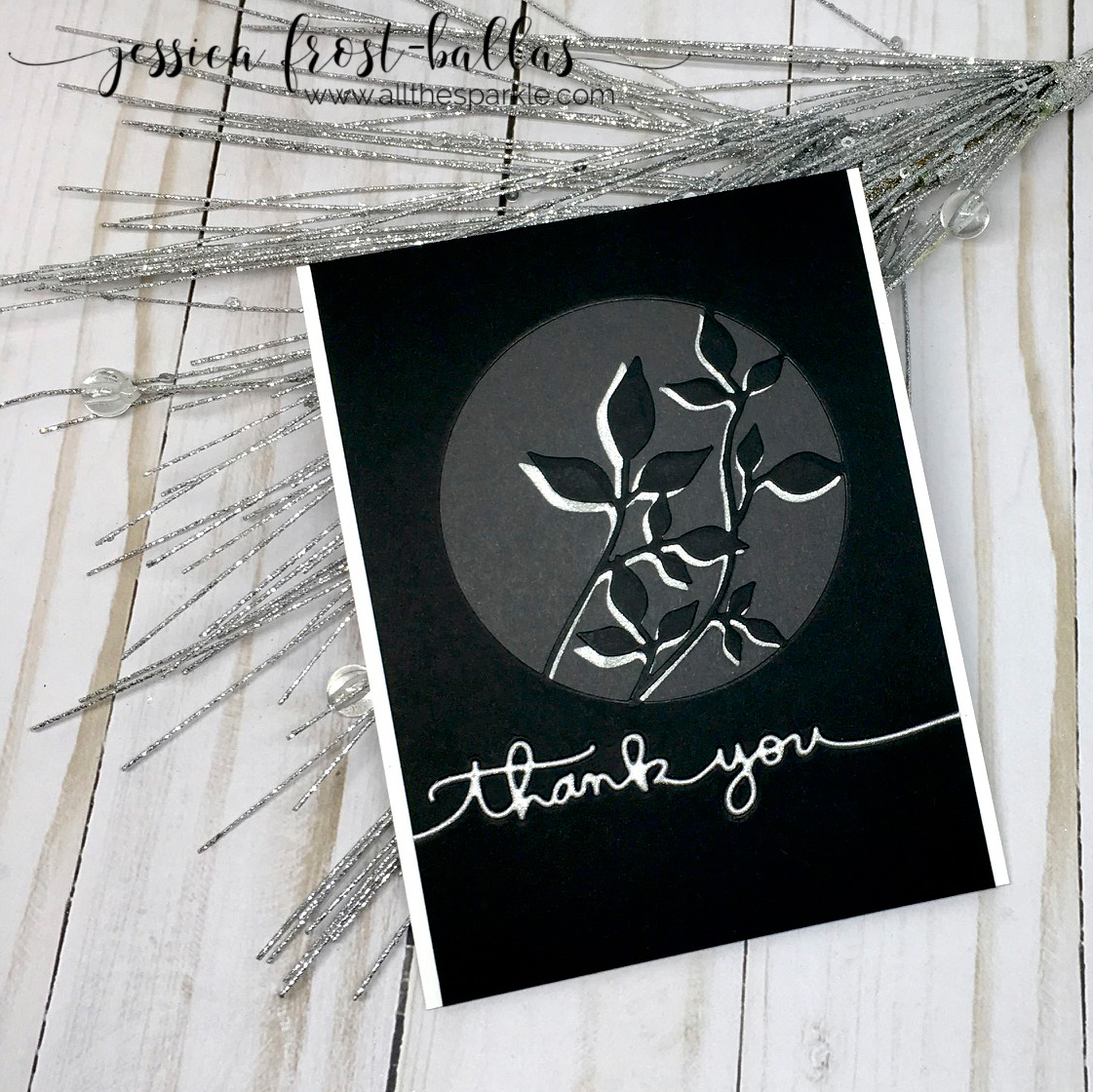 I die-cut the Circle Leaves from silver glitter paper and trimmed it out of the circle. Then I die-cut it again from black cardstock and adhered the silver behind it slightly offset before adding a dark grey base. I also-die cut the sentiment from silver glitter paper and again from the black cardstock panel. I adhered the black cardstock to a white card base and then inlaid the silver glitter paper into the black cardstock for a smooth finish!
