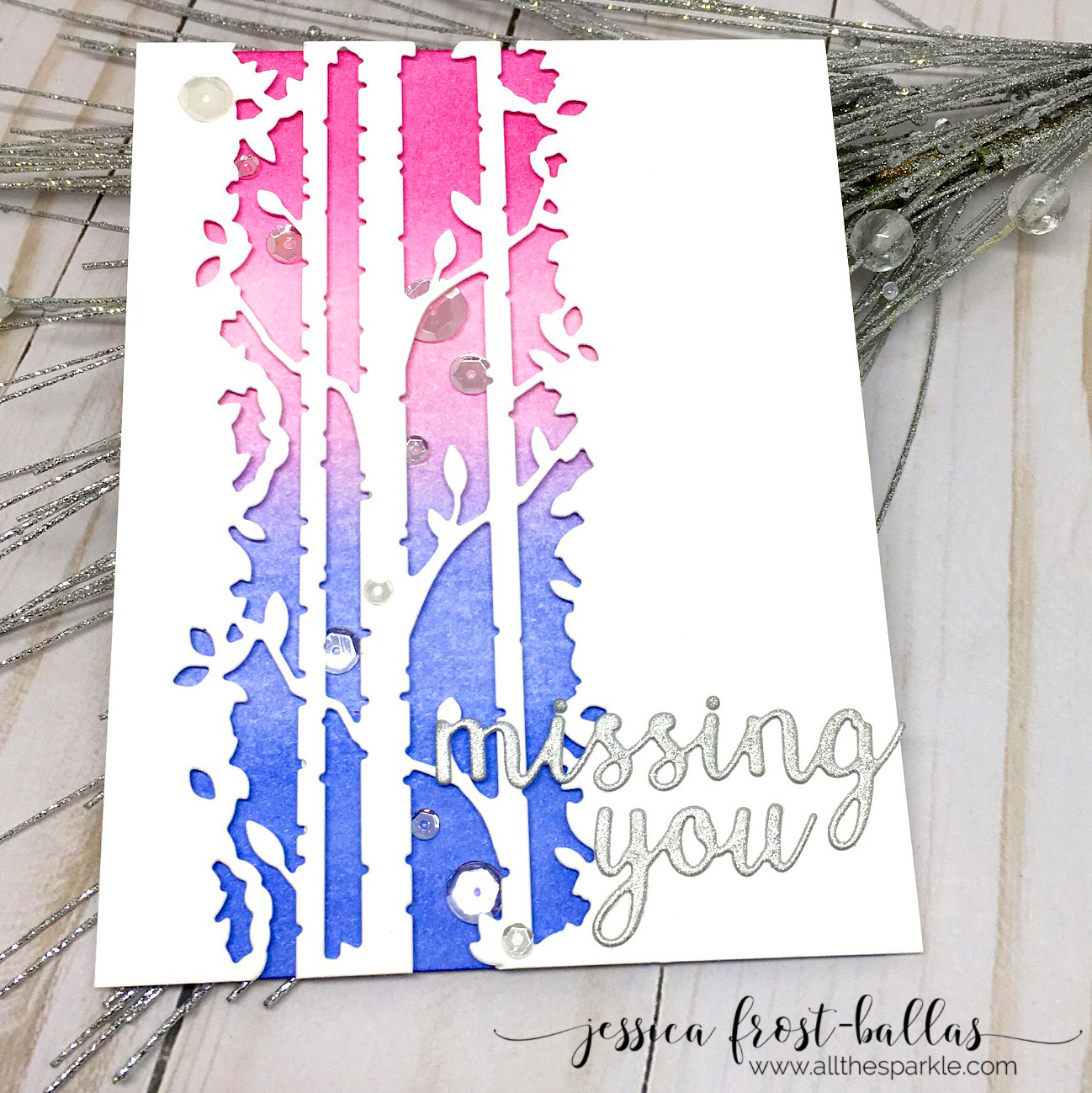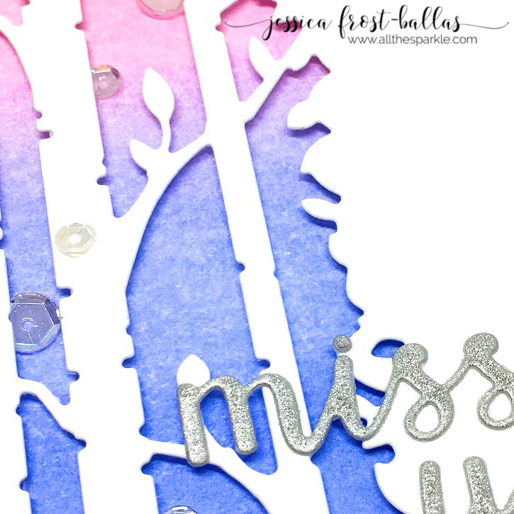 I love the look of this Birch Column die and how it cuts through the bottom and top of your card panel but is one solid piece. I wanted to let that be the focus of my card so I die-cut it with white cardstock and adhered it over a distress inked background. I used picked raspberry, spun sugar, shaded lilac, and blueprint sketch distress ink for the background and spritzed it with shimmer spray. Then I die-cut the sentiment from silver glitter paper and adhered it over my card panel. Finally I added a sprinkling of sparkling clear sequins for a little extra shimmer!