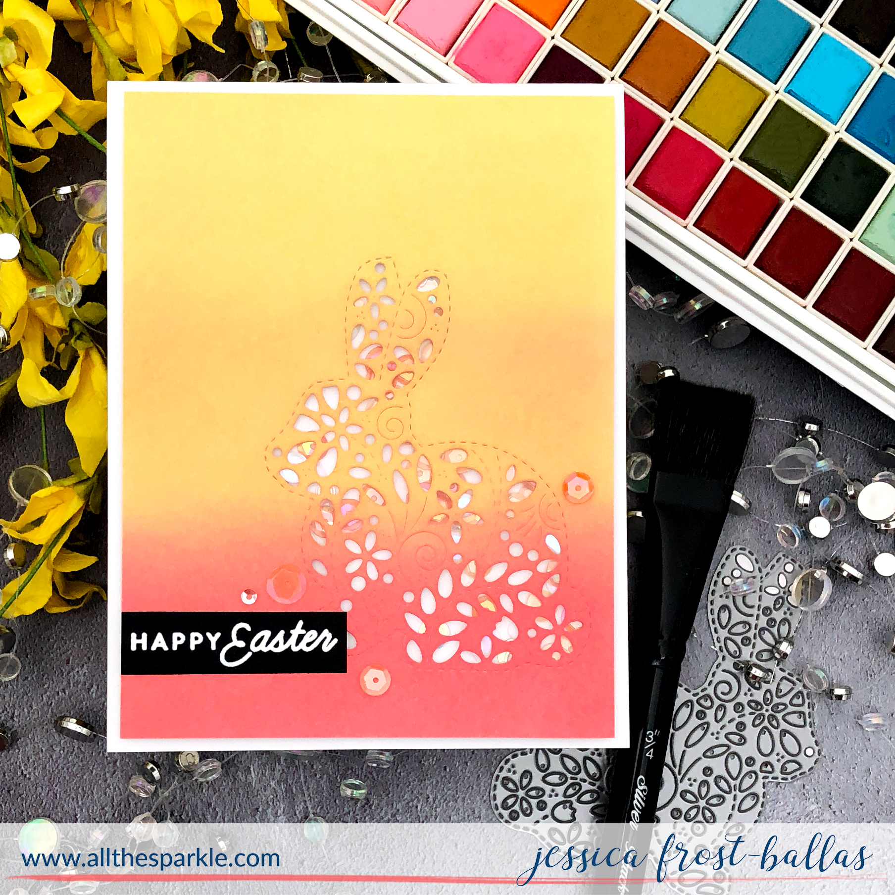 For my second card I started by painting an ombre yellow to coral wash on a piece of watercolor cardstock with the same Prima watercolors. I let it dry thoroughly and then die-cut it with the Filigree Bunny die. I adhered a piece of acetate behind the bunny and then built up a border around the die with a double layer of foam mounting tape. I filled it with You’re Peachy sequins and sealed up the shaker.