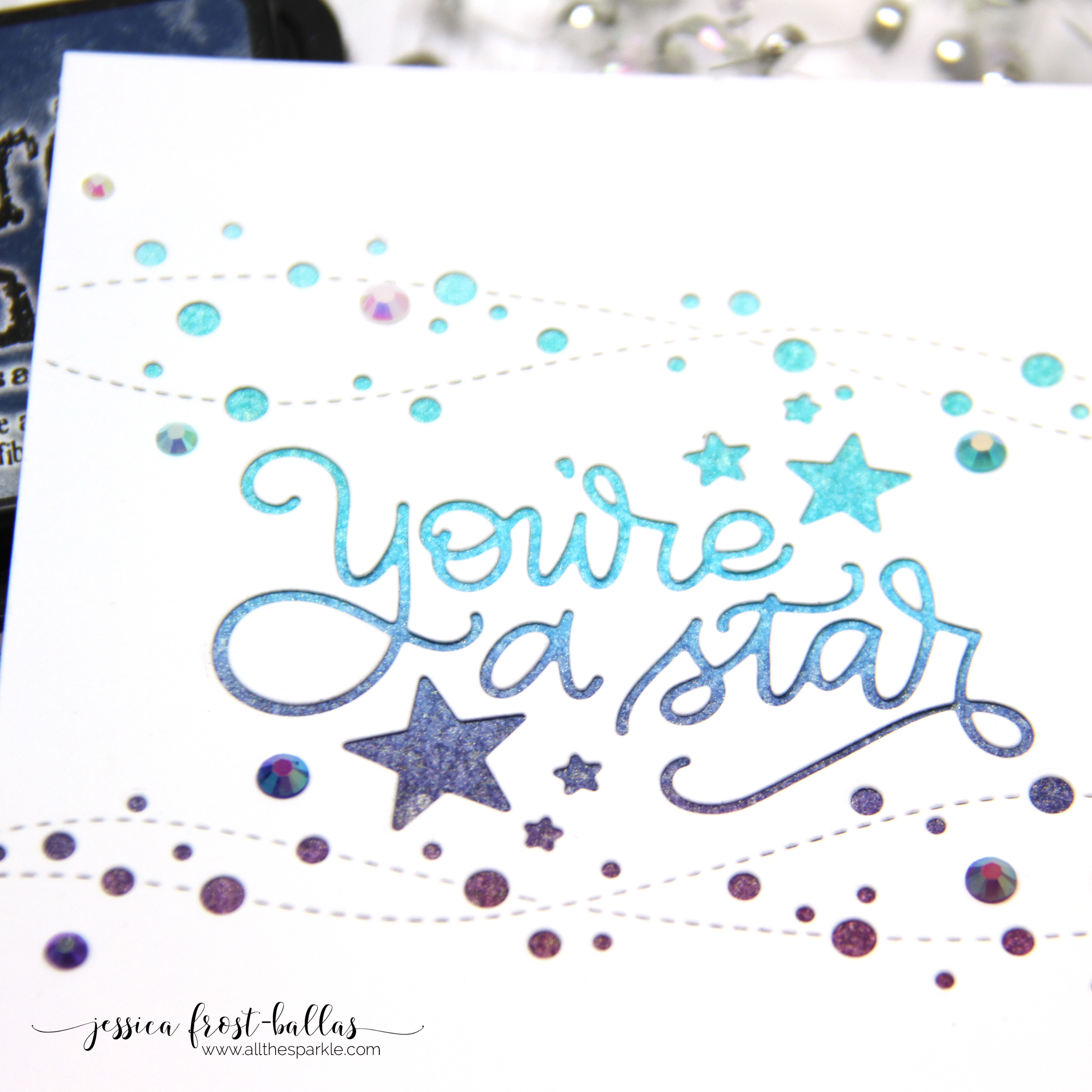 I blended Peacock Feathers, Mermaid Lagoon, Chipped Sapphire, and Seedless Preserves distress ink onto watercolor paper and spritzed it with shimmer spray. Then I ran the You’re A Star and Tickle Breeze dies through my Bigshot with a piece of white cardstock. I adhered that panel over the distress inked panel and added a few jewels in shades of teal, blue, and purple to finish the card!
