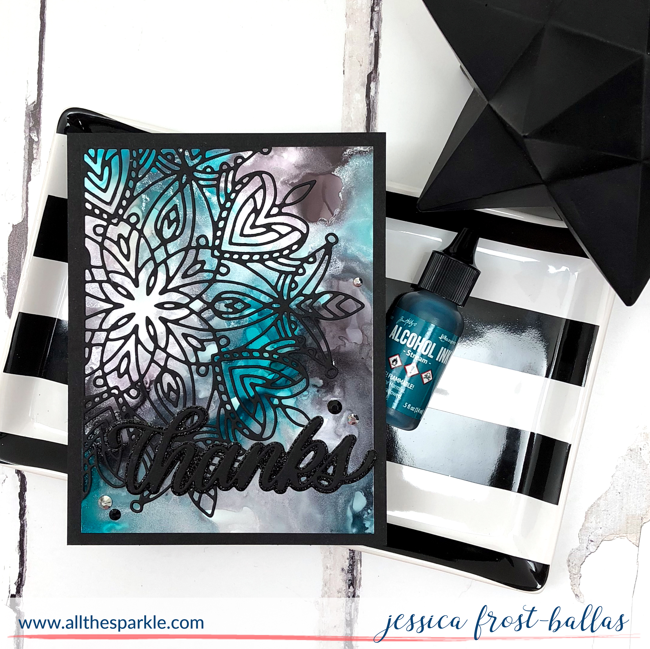 Once the alcohol ink was dry I used liquid adhesive to adhere the stencil and sentiment to the alcohol ink panel. Then I trimmed the alcohol ink panel down and matted it on a A2 black panel which was then adhered to a card base! I finished the card with a few silver and black gems for a little sparkle. I ran out of time this weekend but I think I’m going to try this design in different color palettes…I think it’d be equally interesting in pinks and golds with white cardstock or coral and grey with black cardstock! Hmm…