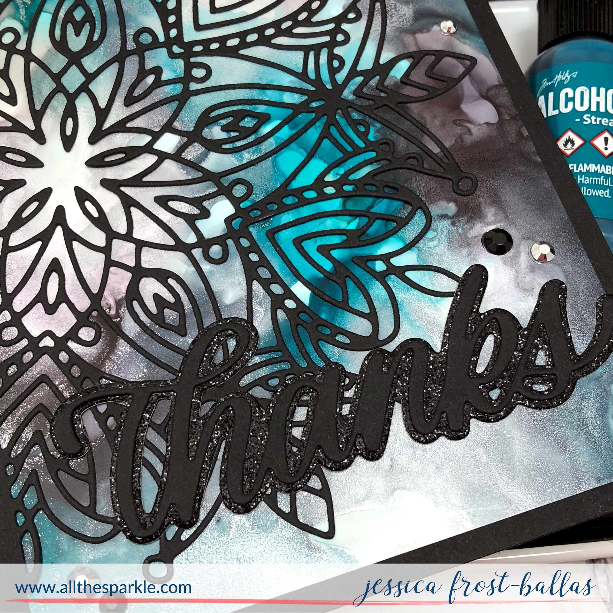 Anyway, I started by blending stream, silver mixative, pitch black, and slate grey alcohol inks onto a piece of yupo paper and used alcohol blending solution and an air puffer to move them around. Once I was happy I set it aside to dry and die-cut the Heart Mandala with black cardstock. At the same time I also die-cut the Big Thanks word die from black cardstock and the word outline die from black glitter paper.