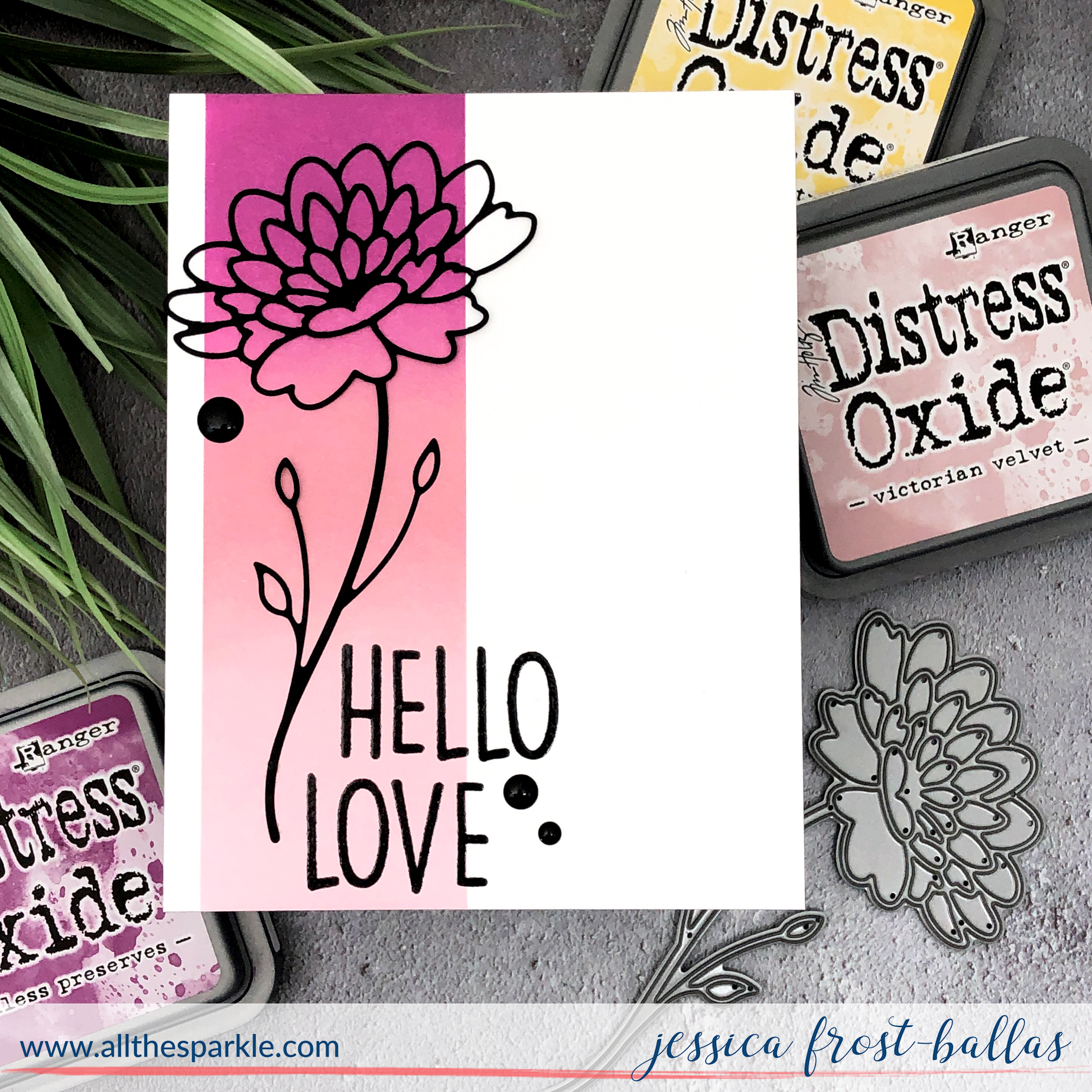 My second card is much simpler but the new Dahlia Stem die makes it quite striking! 😉 I started by masking off an A2 panel of white cardstock. Then I blended it with seedless preserves, victorian velvet, and spun sugar distress oxide ink.