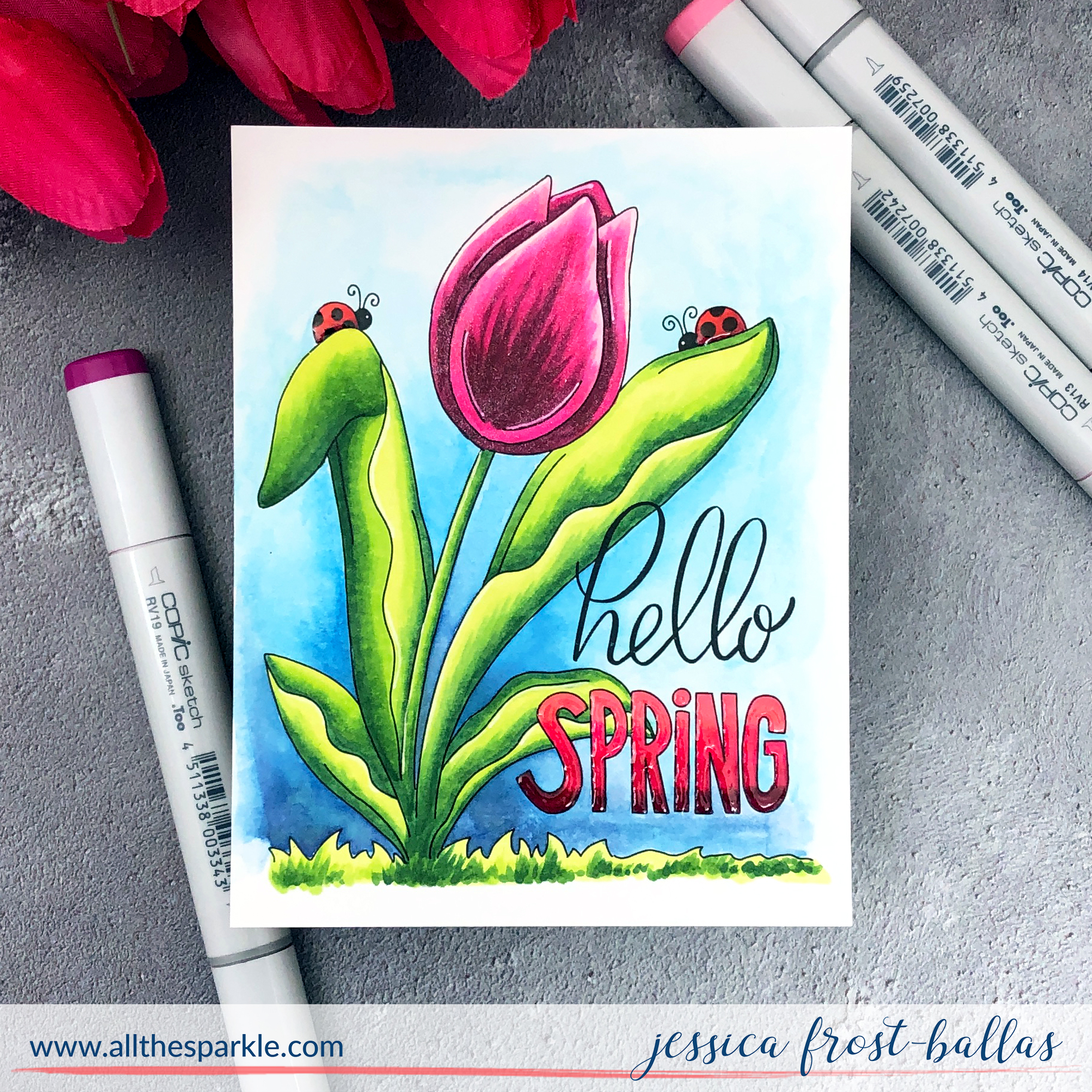Earlier this week I couldn’t sleep and decided to get up instead of continuing to toss and turn. It was very late so my brain wasn’t quite up to making a card but I thought a little coloring might help wear me out! 😉 I pulled out one of the beautiful prints from Suzy’s So Tweet watercolor prints and colored the tulip, grass, and ladybugs with copics. And then luckily I was able to get to bed. 😉 The next morning I watercolored the background with daniel smith watercolors and added a little spectrum noir clear sparkle and nuvo crystal glaze to the sentiment, tulip, and ladybugs! I love these cards because they’re great to pack for travel or, apparently, to help turn your mind off so you can sleep! And that’s it for me today but I’ll be back next week with more to share! If this is your first time visiting my blog I hope you’ll come back soon!