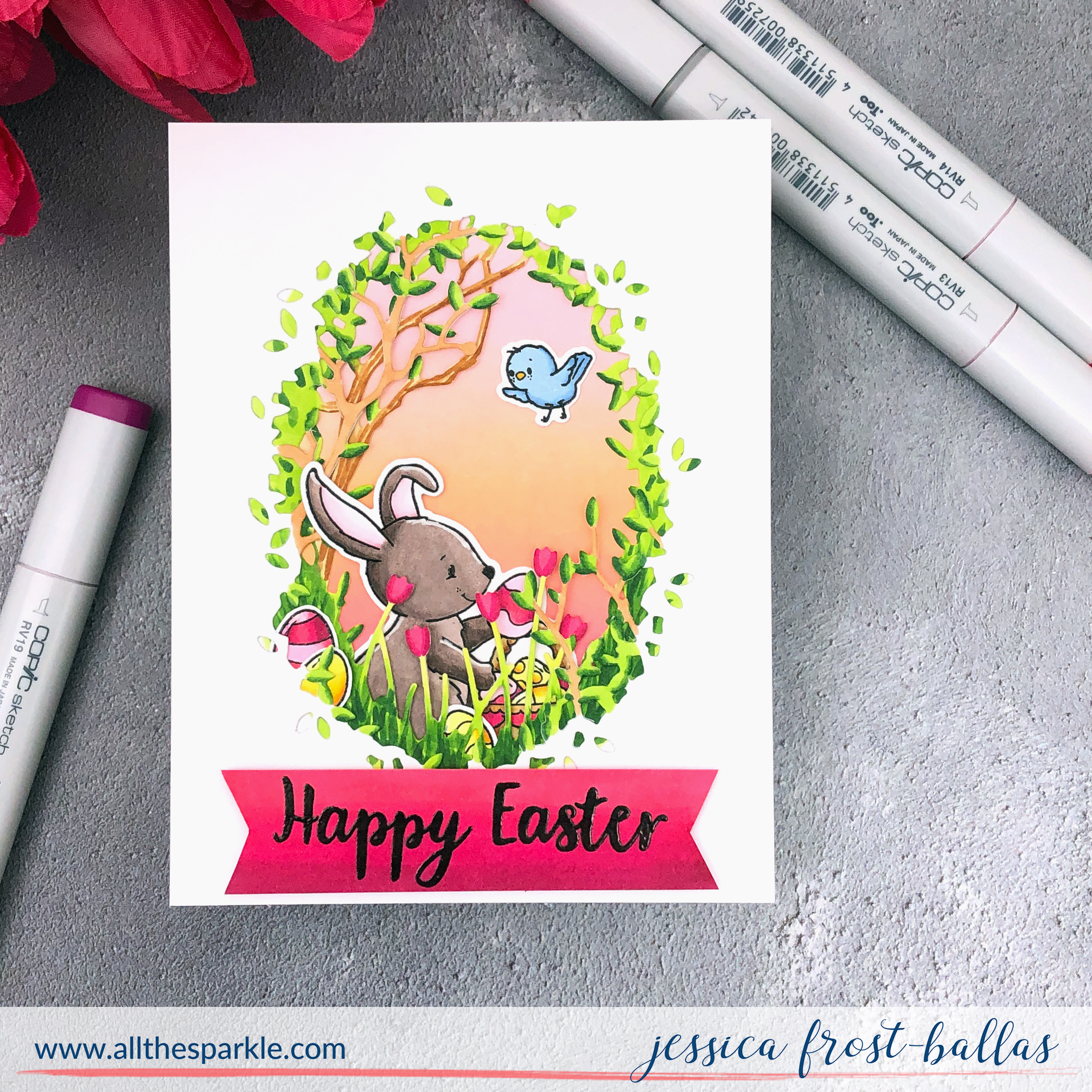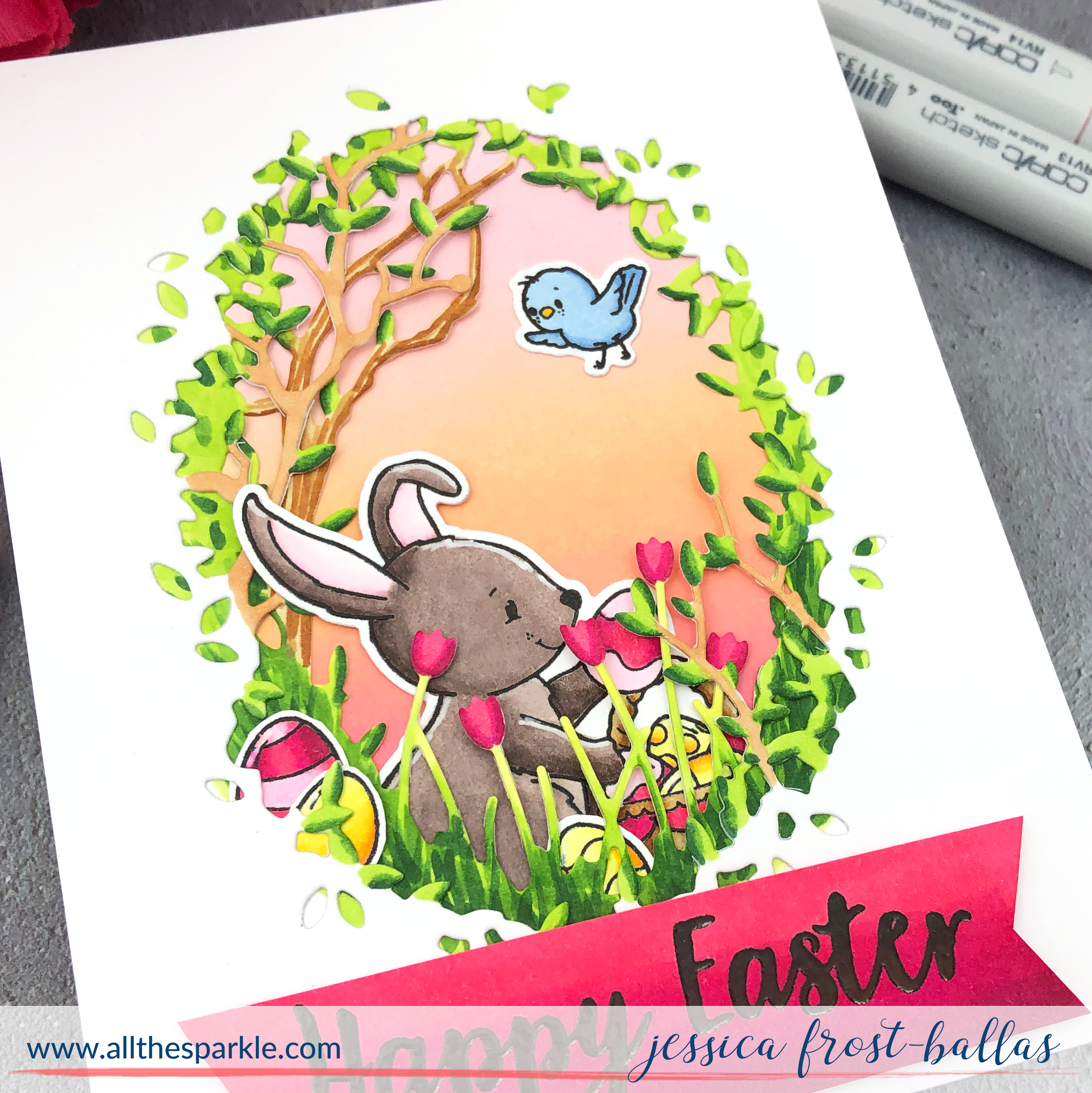 Next I die-cut the Tulip Collage and older Everglade Collage die from white cardstock and colored them with copics. I layered them together and then adhered my bunny behind them. I adhered that over the blended background and then tucked in the eggs and bird with a little adhesive. Finally I added the sentiment with foam mounting tape! I love the way the scene comes to life with a few copics! 😉