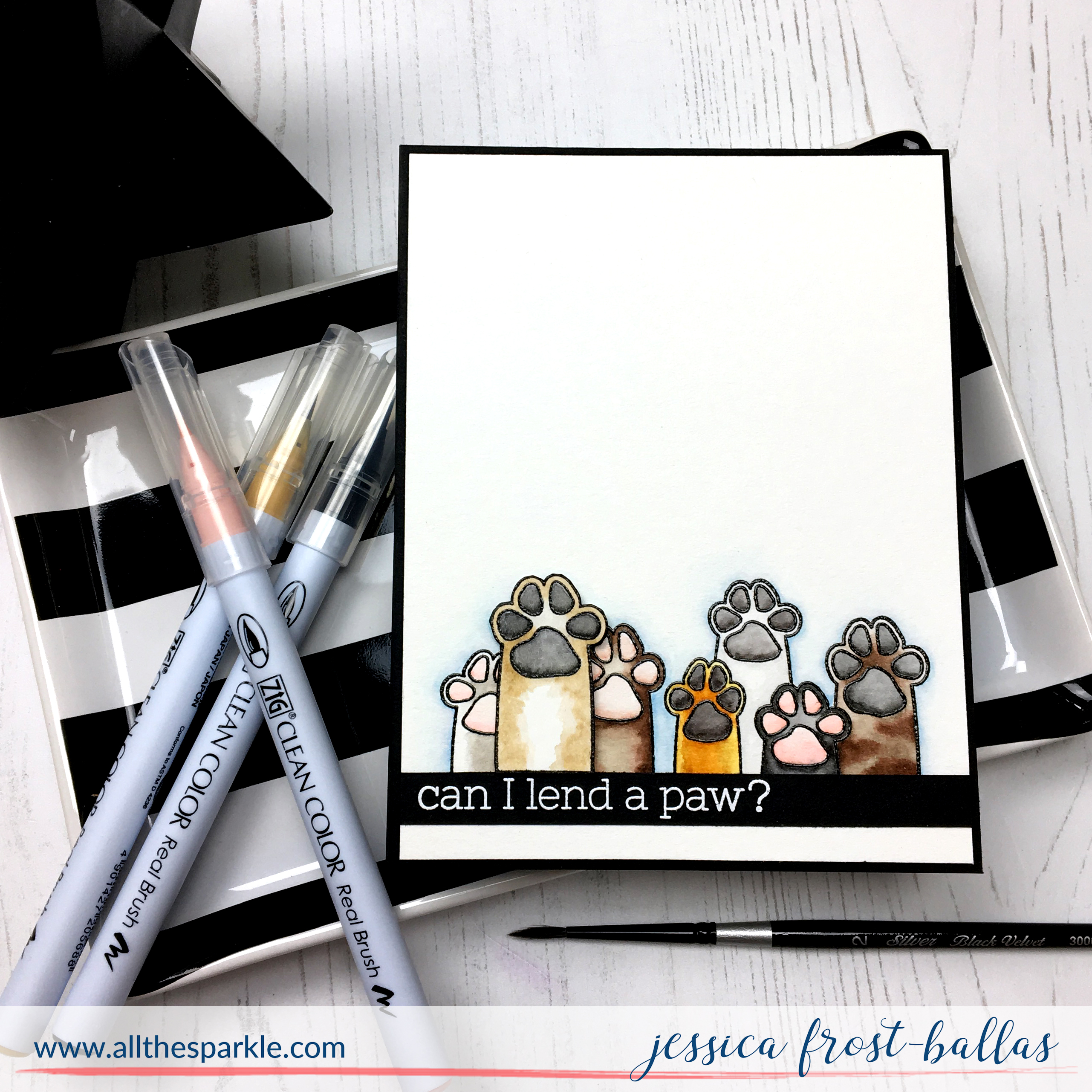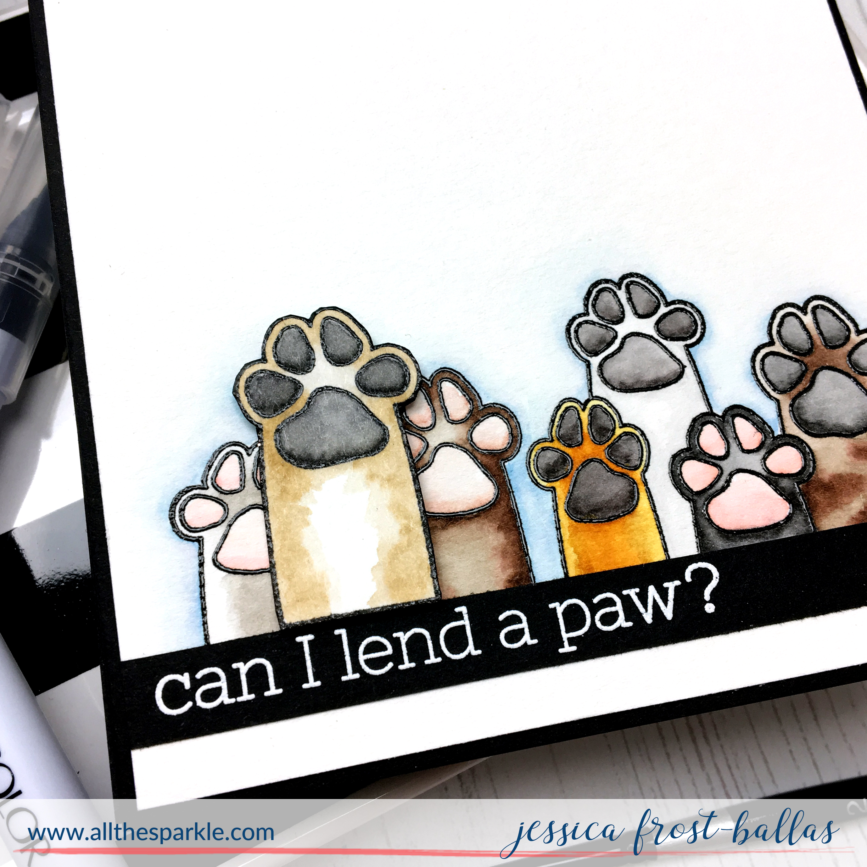 It’s been awhile since I’ve dabbled with watercolors but those adorable puppy paws were just screaming for some soft watercoloring! I kept it simple and pulled out my zig clean color real brush markers and a small round paintbrush. I started by stamping the paws onto Canson Montval cardstock with versafine and heat-embossed it with clear embossing powder. Then I added a little color with the zig markers and then blended it out with a damp paintbrush. I also added a soft wash of blue in the background to highlight the fur colors. I also stamped the large paw on a scrap of cardstock, watercolored it, and fussy cut it without a border.