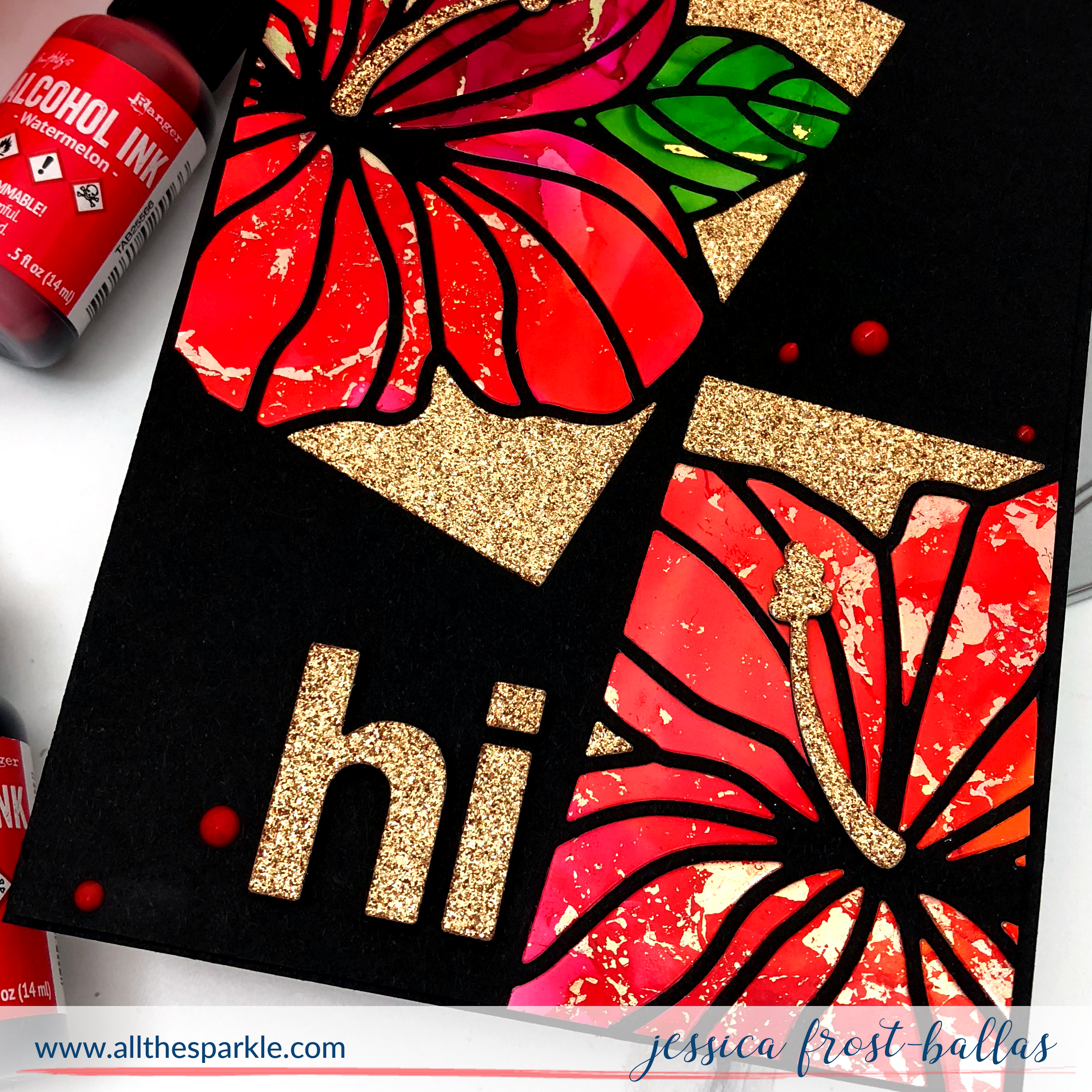 I thought a gorgeous tropical die like the hibiscus frame called for some bright tropical colors and one of the easiest ways to achieve a super vibrant look is with alcohol inks! Add a little gold foil and we’re good to go! 😉