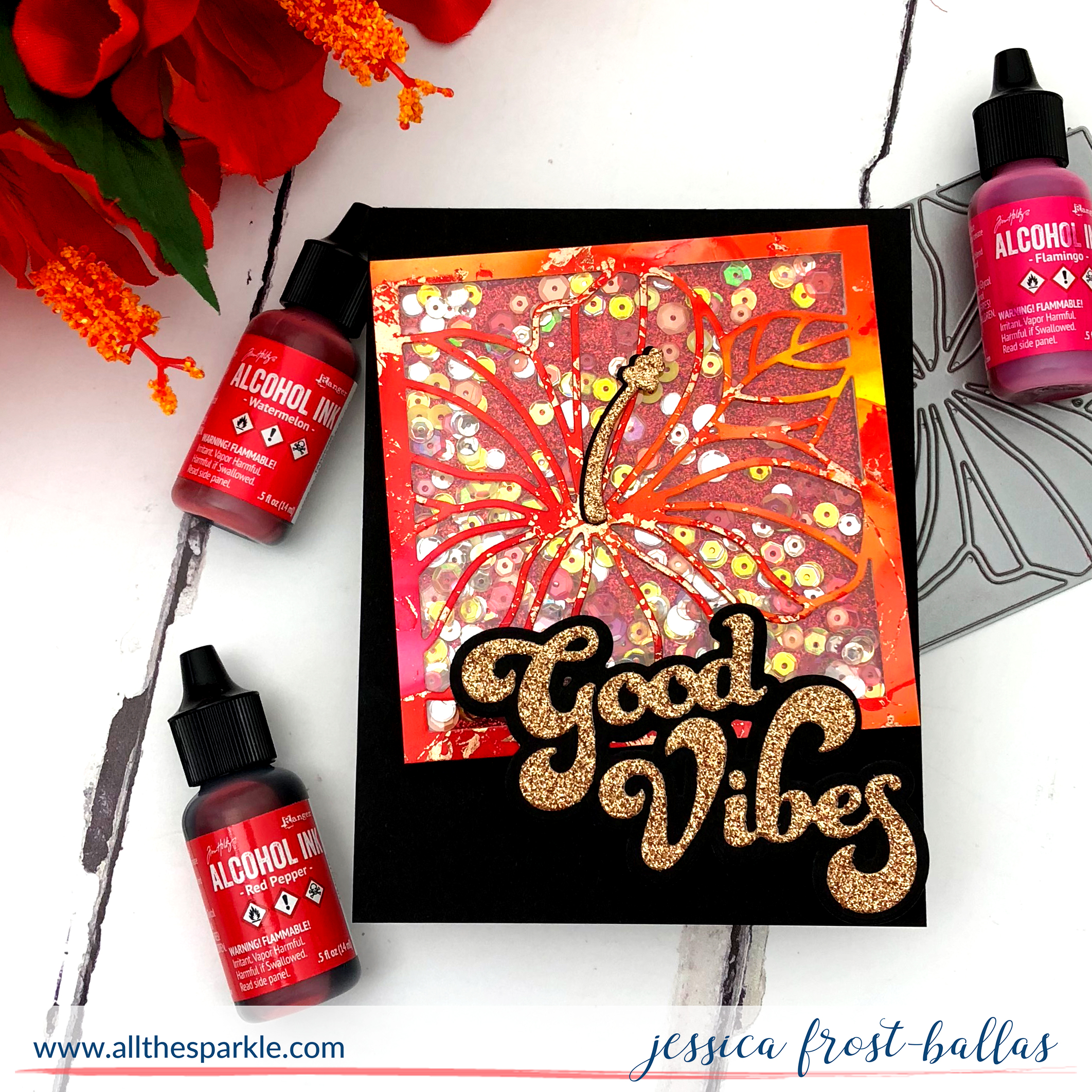 My second card uses the leftover alcohol ink die-cut outline to create a shaker card! I adhered a piece of acetate behind the alcohol inked hibiscus, added a double layer of foam mounting tape and filled it liberally with rose gold, red, yellow, orange, iridescent clear sequins, and clear confetti before sealing it up with a panel of red glitter paper.