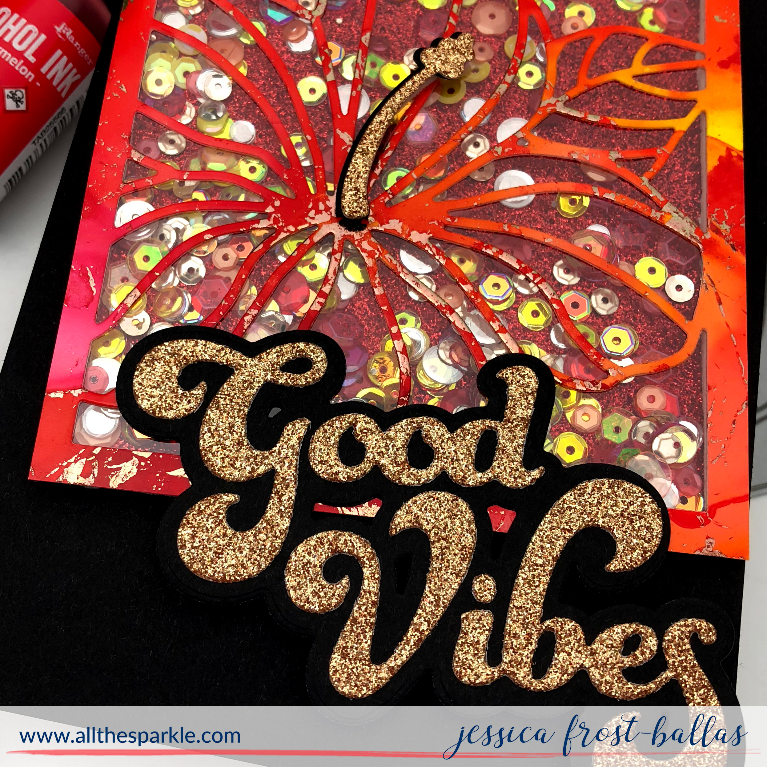I adhered the shaker to a black cardstock panel. Next I die-cut the Good Vibes sentiment and the flower center from black and gold glitter cardstock and adhered them to the card. I used regular adhesive for the flower center and foam mounting tape for the sentiment.
