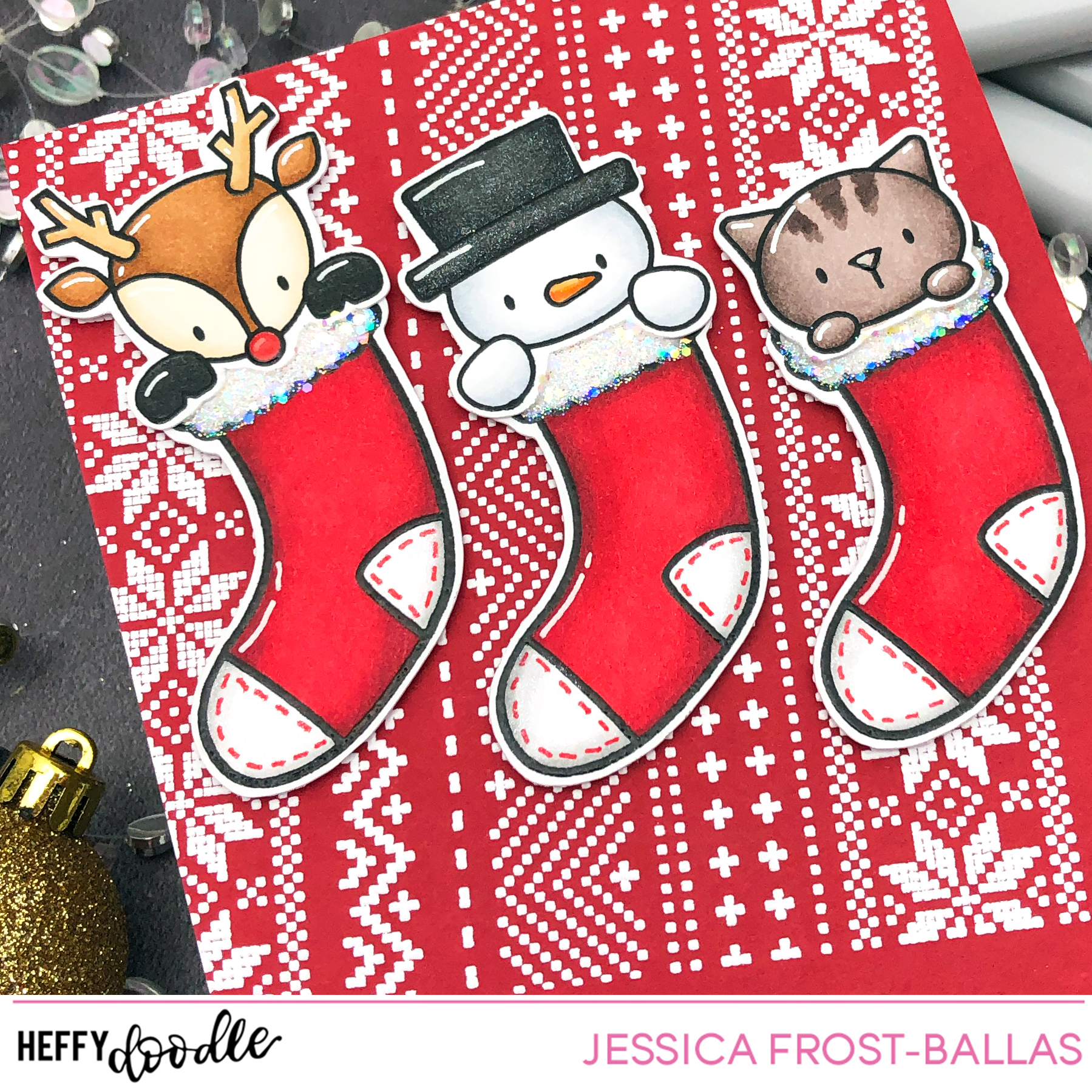 While that was drying I stamped the Christmas Sweater background at an angle onto Cherry cardstock with versamark and heat-embossed it with white embossing powder. I also stamped the sentiment and heat-embossed it with the same powder. Finally I added my stockings with more foam tape and then added a few touches of spectrum noir clear sparkle and more crystal glaze to the critters to finish the card!