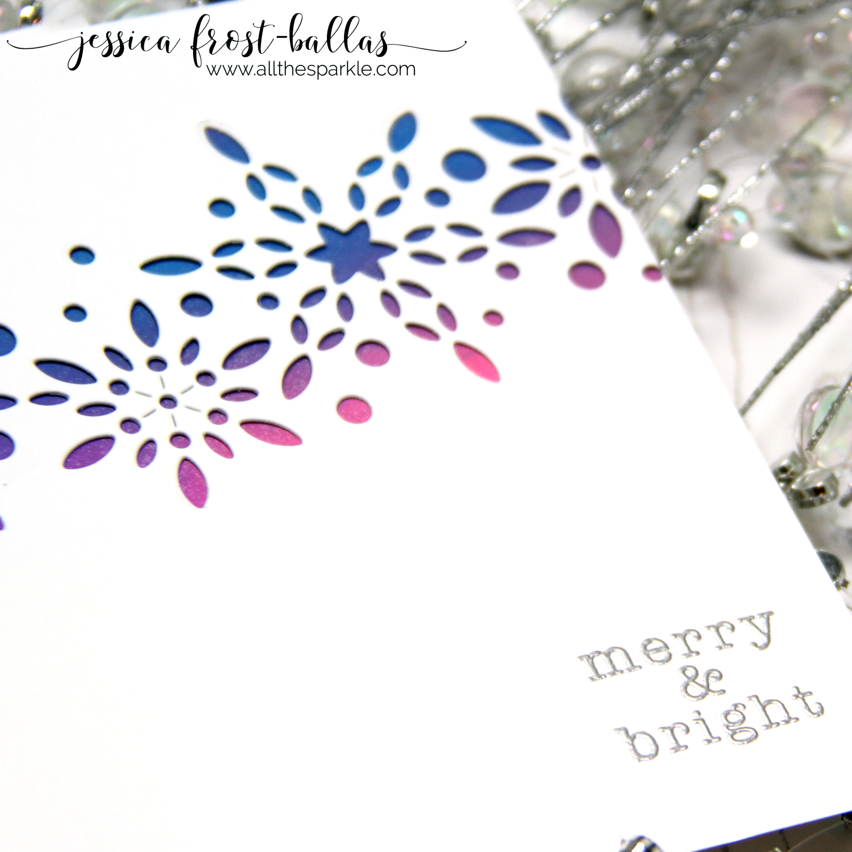 My second card uses some scraps from my first card. I wasn’t entirely sure what colors I wanted to use for the background so I experimented with a few possibilities. And I loved them so I didn’t want them to go waste. I simply blended distress inks onto white cardstock and then adhered them to a card base. I die-cut the new Snowburst Collage from the white cardstock and adhered them over the blended backgrounds. Finally I stamped the sentiment from Merry and Bright and heat-embossed it with silver embossing powder.