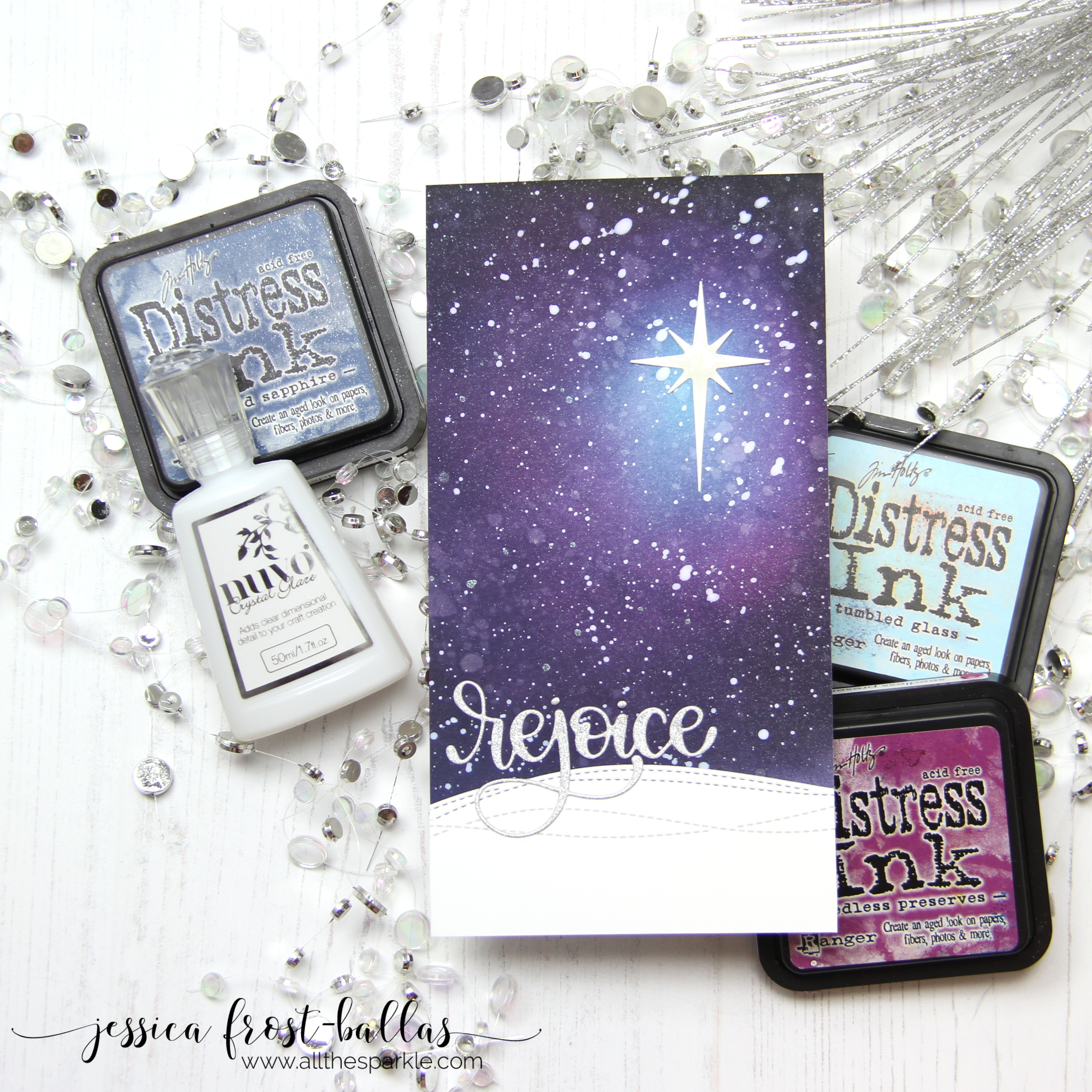 Then I die-cut the Drifting Stitches die twice from white cardstock to create hills and adhered them to my blended background. I die-cut the Holy Stars die from white cardstock, adhered it to the background, coated it with a layer of spectrum noir clear sparkle, and then added a layer of nuvo crystal glaze for a little extra shimmer and shine. Finally I die-cut the Rejoice word die from silver glitter cardstock and adhered it over the hills.