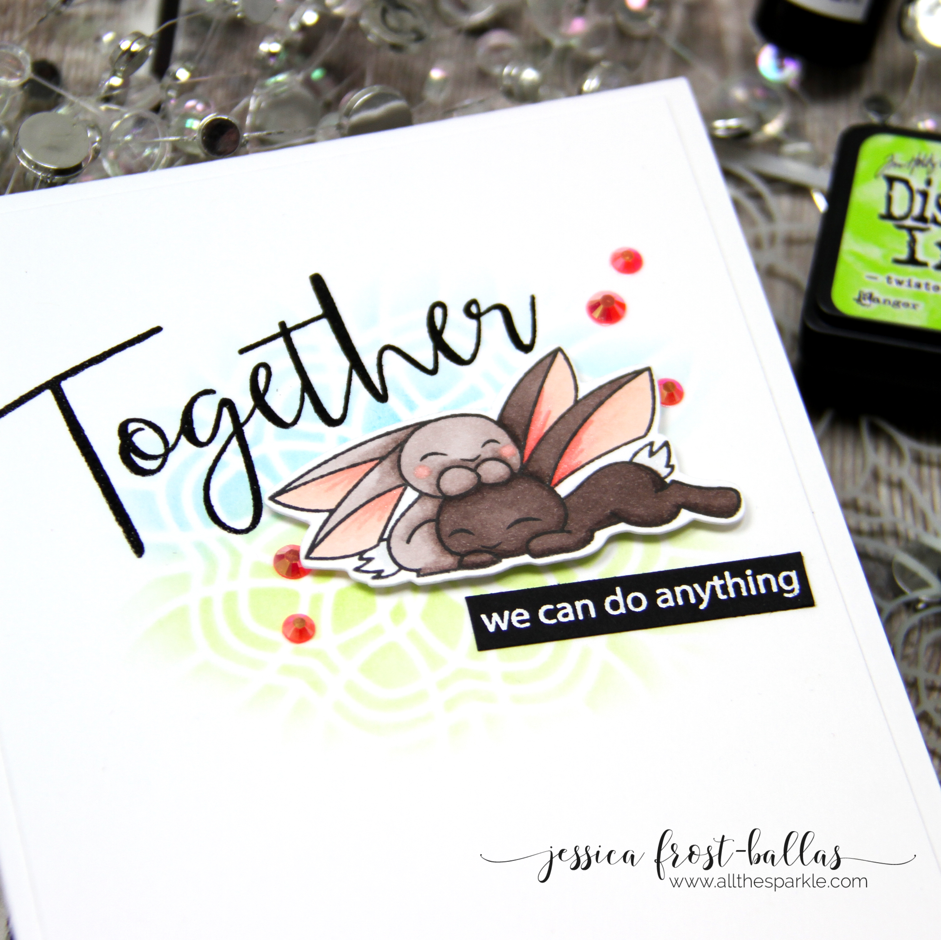 These little bunnies from Forever Friends showed up in my mailbox earlier in the week and I just cannot get over how adorable they are! To start my card I colored them with copic markers and fussy cut them leaving a bit of a white border around them. Then I placed the Stained Glass stencil over a piece of white cardstock and blended a little twisted citron and salty ocean distress ink over the center of the stencil to create a subtle grass and sky scene. I stamped the first word of my sentiment from Together with versafine and heat-embossed it with clear embossing powder. Then I stamped the rest of the sentiment on black cardstock and heat-embossed it with white embossing powder before trimming it down to a label. I adhered my bunnies with foam mounting tape and then added my sentiment label with ATG adhesive. Finally I finished the card with a few strawberry jewels a little spectrum noir clear sparkle on the bunnies ears, tails, and cheeks!