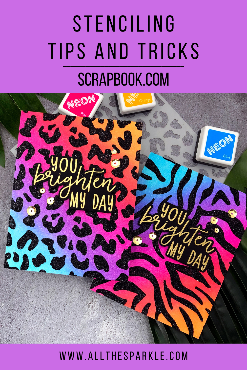 Be sure to watch the video for more detailed tips and tricks on stenciling! I really love the sparkle of the glitz gel and it pairs beautifully with the neon inks! I think these might have been the two cards I enjoyed making the most this year!