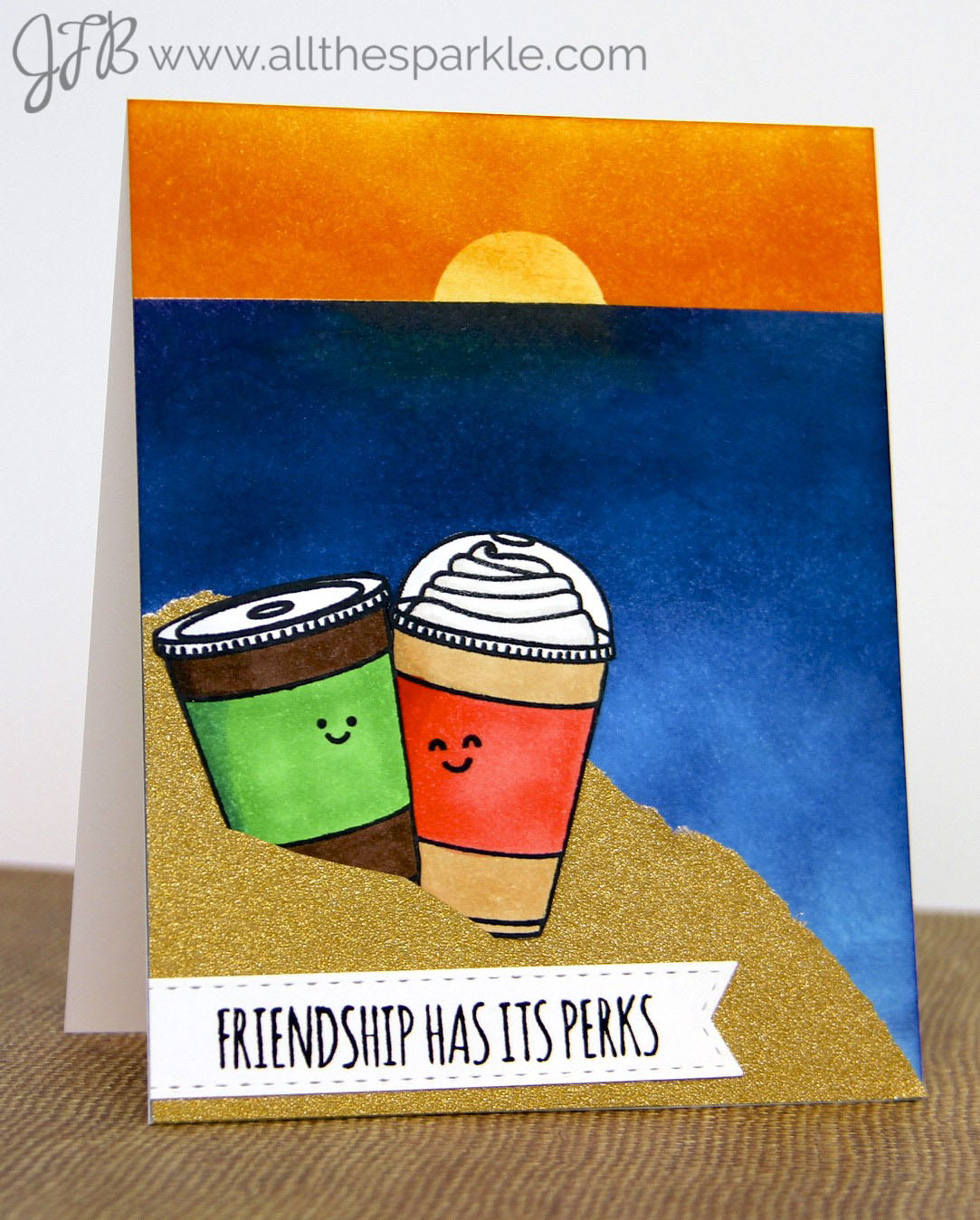 Fun card and beautifully inked and colored. Love the look of the ocean at sunset you’ve created, and those cups are so cute. Great card! Love it.