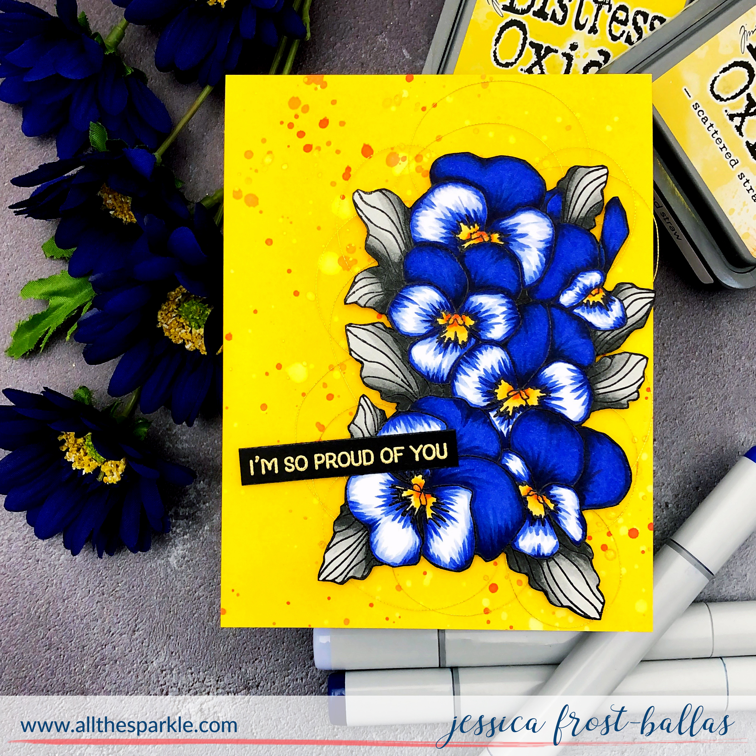 Next I ink-blended a panel of strathmore bristol cardstock with scattered straw, mustard seed, and wild honey distress oxide ink. I focused the darkest color in the center and blended out to the lightest around the edges. After the panel was dry I splattered it with water, metallic gold paint, and distress oxide inks in wild honey and ripe persimmon. While it was drying I stamped a sentiment from Pretty Pansies onto black cardstock with versamark and heat-embossed it with gold embossing powder before trimming it down to a thin label. Next I added adhesive to the back of the pansies and coiled a little bit of metallic gold thread on the adhesive. Then I added a layer of foam mounting tape to the pansies and adhered it to my blended panel. When I add thread to a card I like to keep a layer of foam tape between the base of the card and the thread to give the thread a little dimension! Finally I added the sentiment with foam tape! I’ll admit, I don’t think I’ve ever used so much yellow on a card ever before but I kinda love how cheery it is! 🙂 Definitely brightens your day! 😉