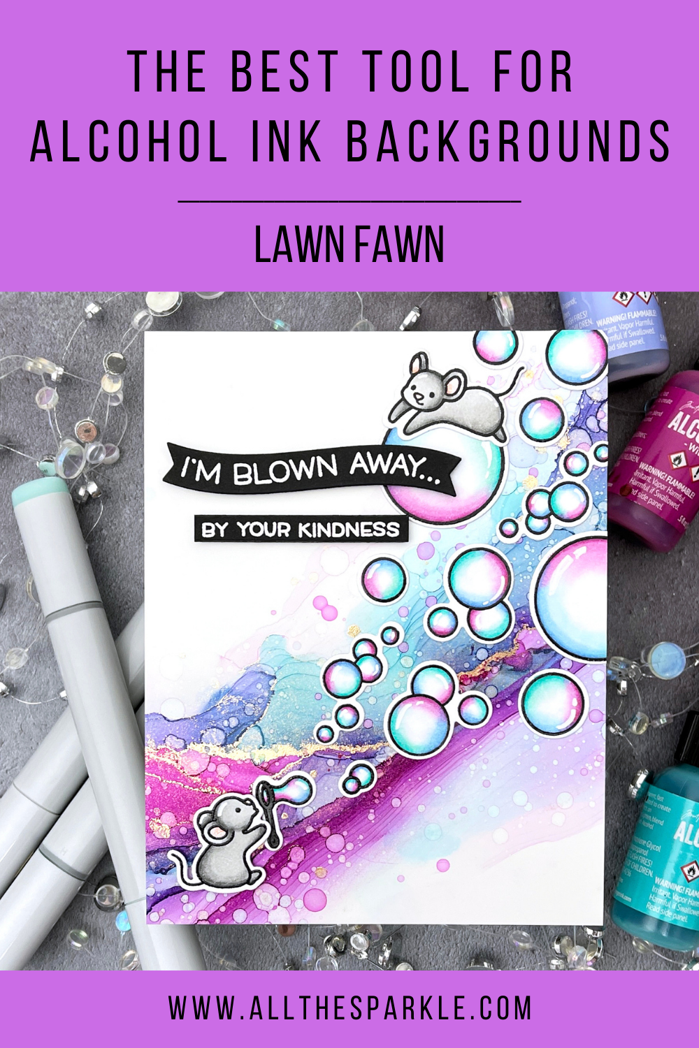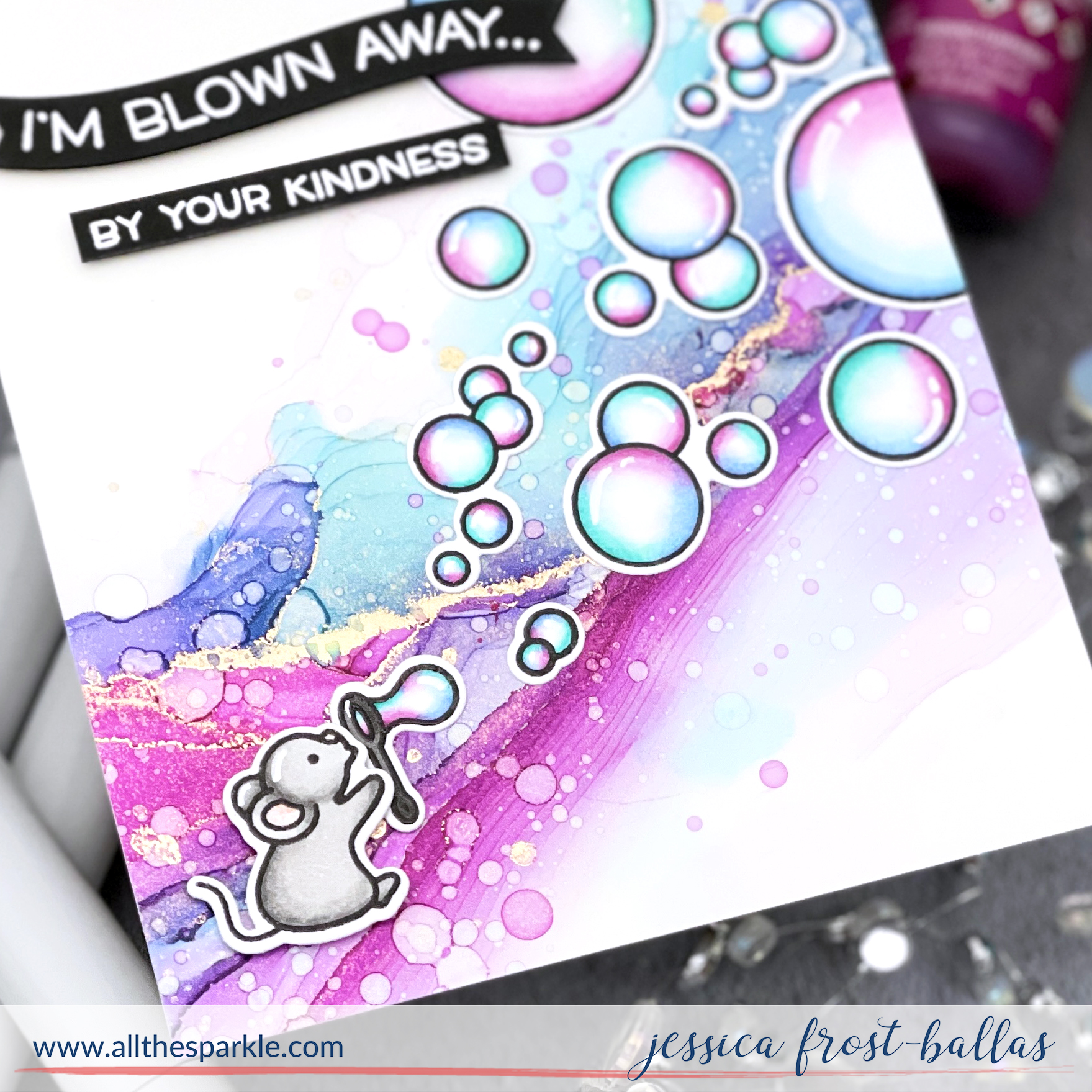 I wanted to use those cute mice from Bubbles of Joy and figured a soft, sparkly alcohol ink background would be the perfect pairing! I used wild plum, pool, and peri peri Ranger alcohol ink along with Pinata brass metallic ink and just a few hints of opal foil!