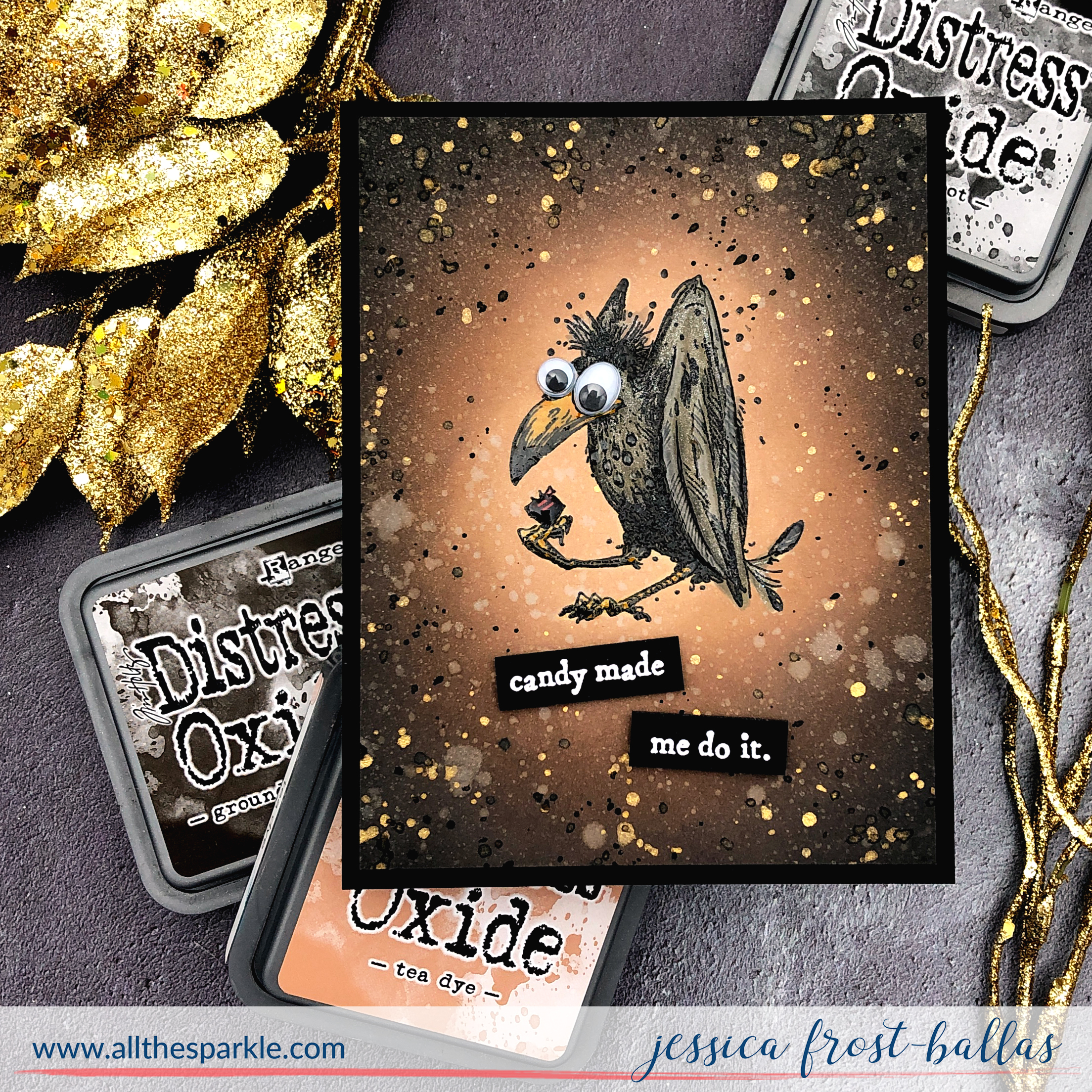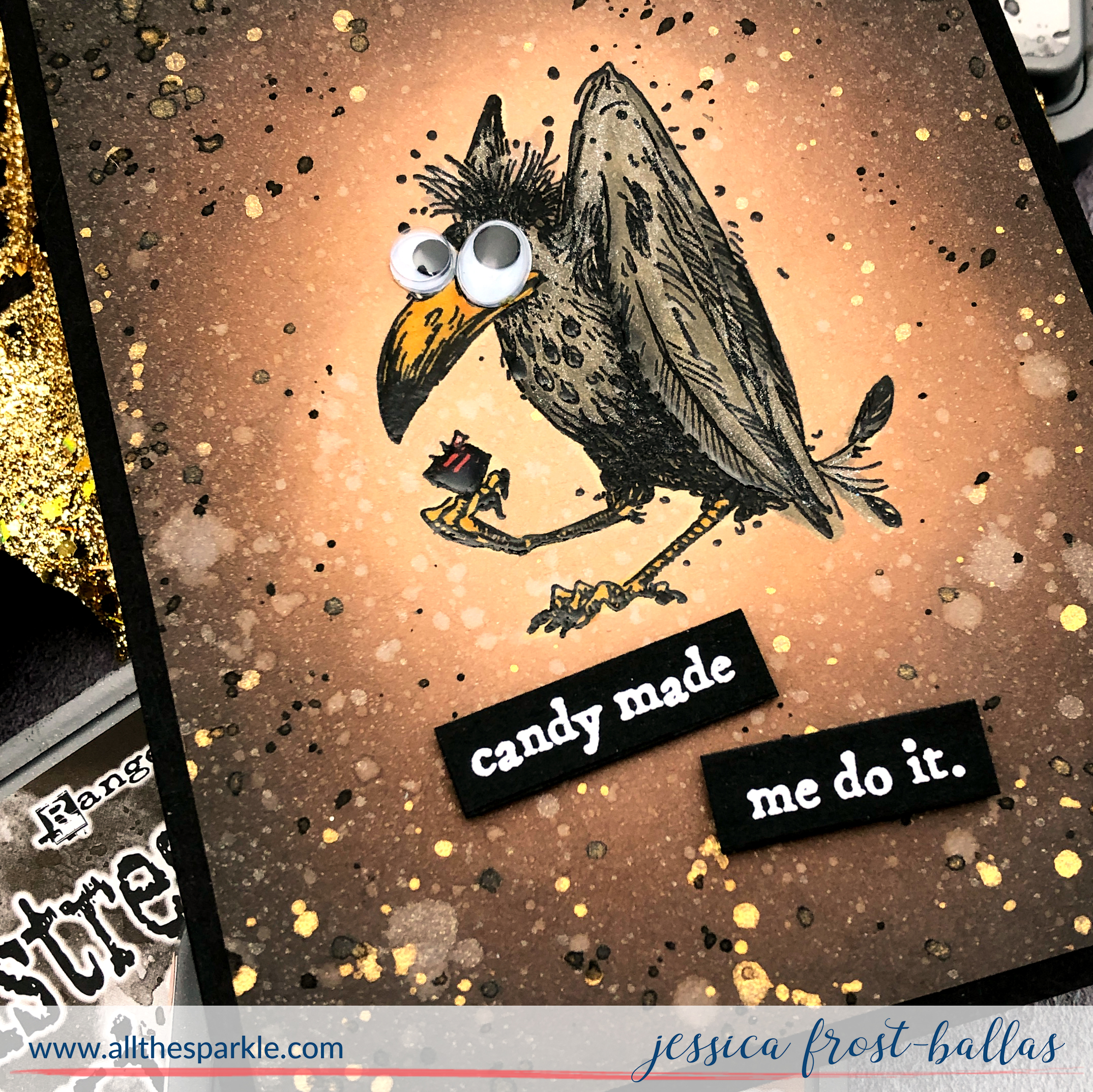 Once the background was totally dry I trimmed it down and adhered it to a black card base. Then I removed the mask and colored the bird with copic markers in shades of E70, E71, E74, and E77. I used Y35 and Y38 for his beak and feet and R35 for the candy in his feet. I added googly eyes to give him an even crazier look and then added a little spectrum noir clear sparkle to his feathers. I added a sentiment label white heat-embossed on black cardstock and finished the card by adding crystal glaze to some of his feathers for a little extra shine! Definitely out of my normal wheelhouse but I kinda love how he turned out! And now I want some candy! 😉