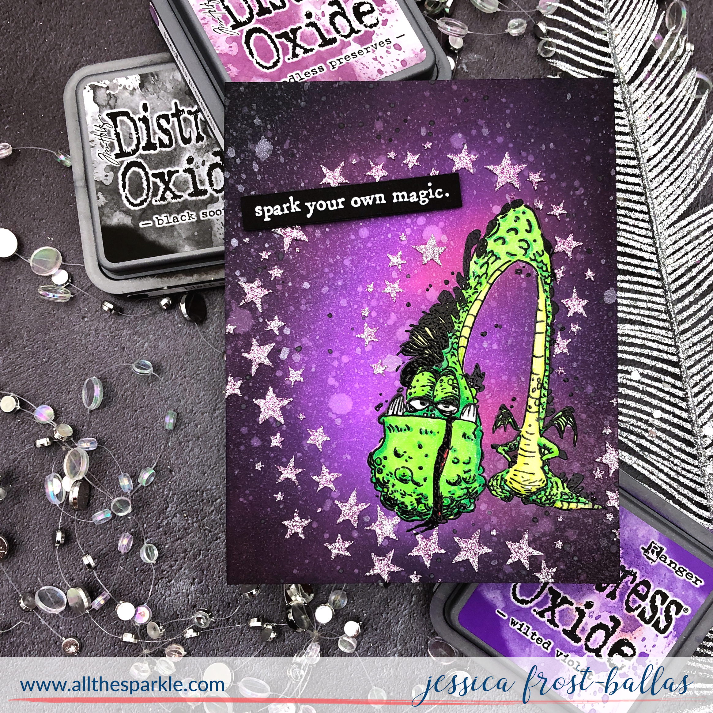 To start I stamped the sad dragon onto a panel of white cardstock with versafine and heat-embossed it with clear embossing powder. I also stamped the dragon on masking paper and fussy cut a mask for him. I placed the mask over the dragon and then blended wilted violet, seedless preserves, and black soot distress oxide ink over the panel. Leaving the mask in place I splattered the panel with water a few times and blotted off the excess. I also splattered it with black soot reinker and Ranger mica spray in brushed pewter. I let that dry and then placed the included stencil over the panel. I applied Nuvo glimmer paste in Silver Gem over the panel and then removed the stencil and mask and let it dry completely.