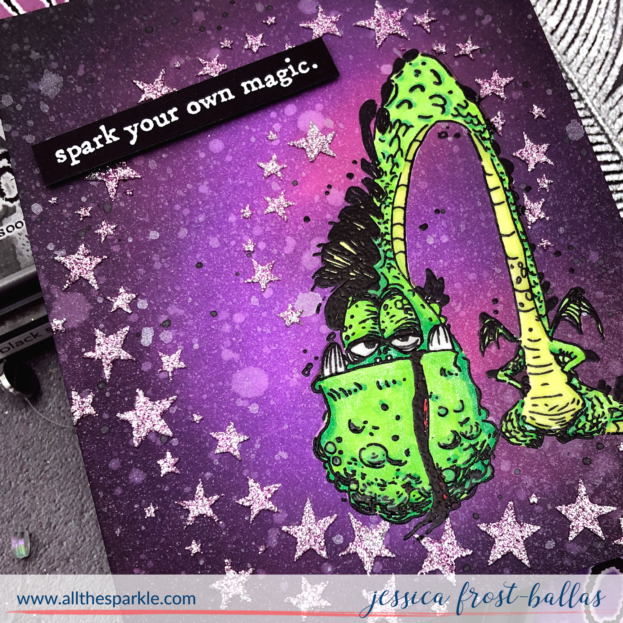 Once the panel was dry I colored the dragon with copic markers. I also added crystal glaze across his eyes, teeth, belly, and some of his spots for a little more texture and dimension. Finally I added a sentiment label white heat-embossed on black cardstock to finish the card! Again definitely out of my usual comfort zone but it was a lot of fun to play with something so different and I hope you enjoyed my forays into more of a mixed media project! 😉
