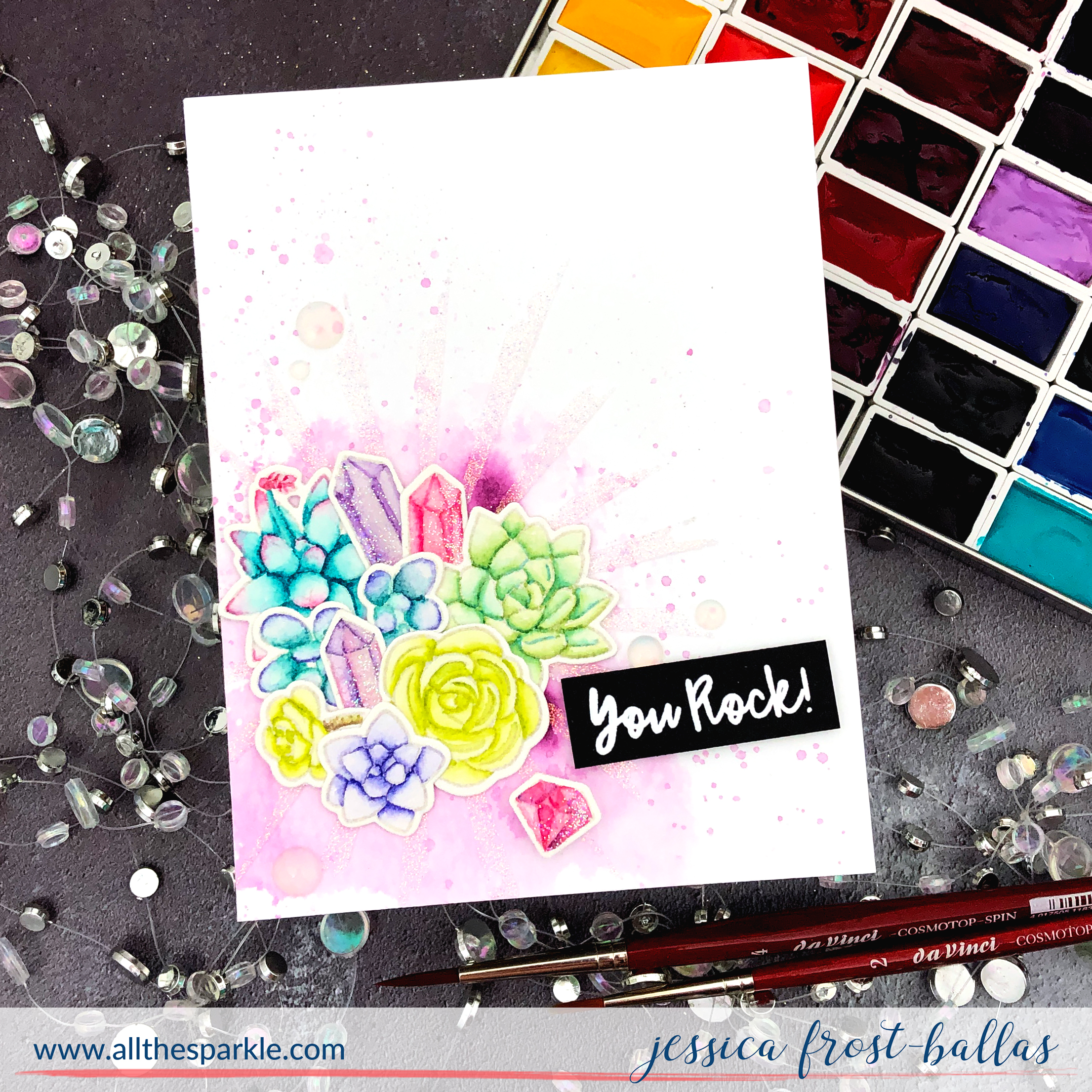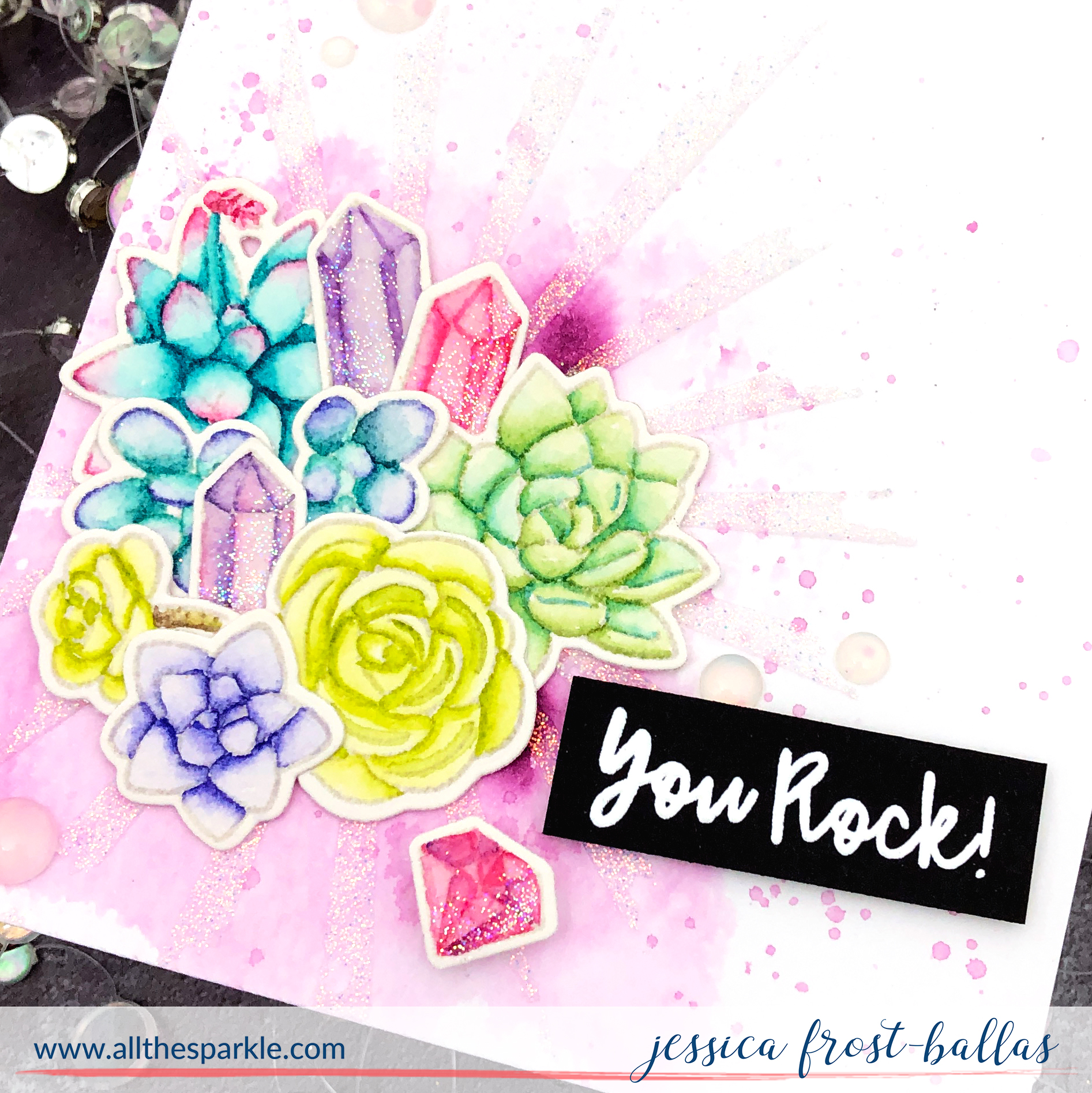 While it was drying I stamped a sentiment from Succulent Sparkle onto black cardstock with versamark and heat-embossed it with white embossing powder. Once everything was dry I created an arrangement with my succulents and gems and adhered them to the stenciled panel with a mixture of regular adhesive and foam mounting tape. Next I added the sentiment and a few new embellishments from the release. Finally, to finish the card, I added a layer of nuvo crystal glaze to the gems and sprinkled them with prisma glitter. This card just GLOWS when it catches the light! I wish I could share it with each of you! 🙂