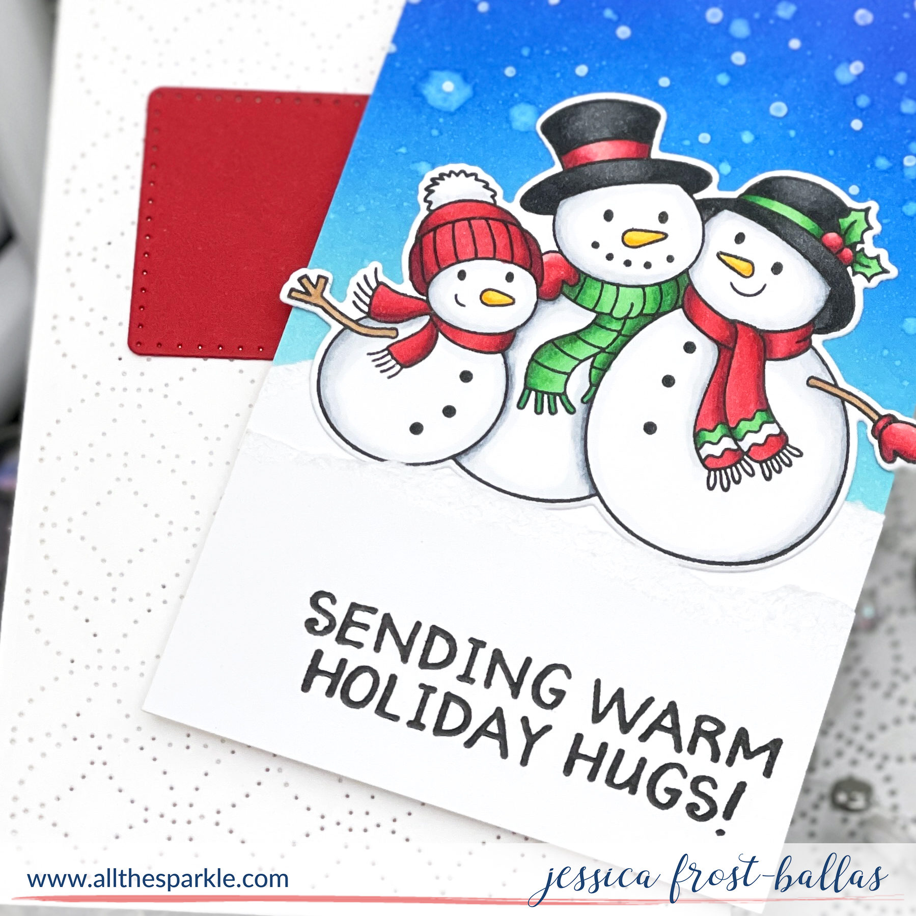 Next I blended a background for my scene using prize ribbon, blueprint sketch, salty ocean, and salvaged patina distress oxide ink. I splattered it with water and then applied a thin layer of white pearlescent paste over the stencil to create my snowy sky. I stamped the snowman family from Hey Snowmies with copic friendly black ink and colored them with copic markers before die-cutting them with the coordinating dies. I tore a ground from white cardstock and then added a sentiment from the Hey Snowmies set to finish the card!