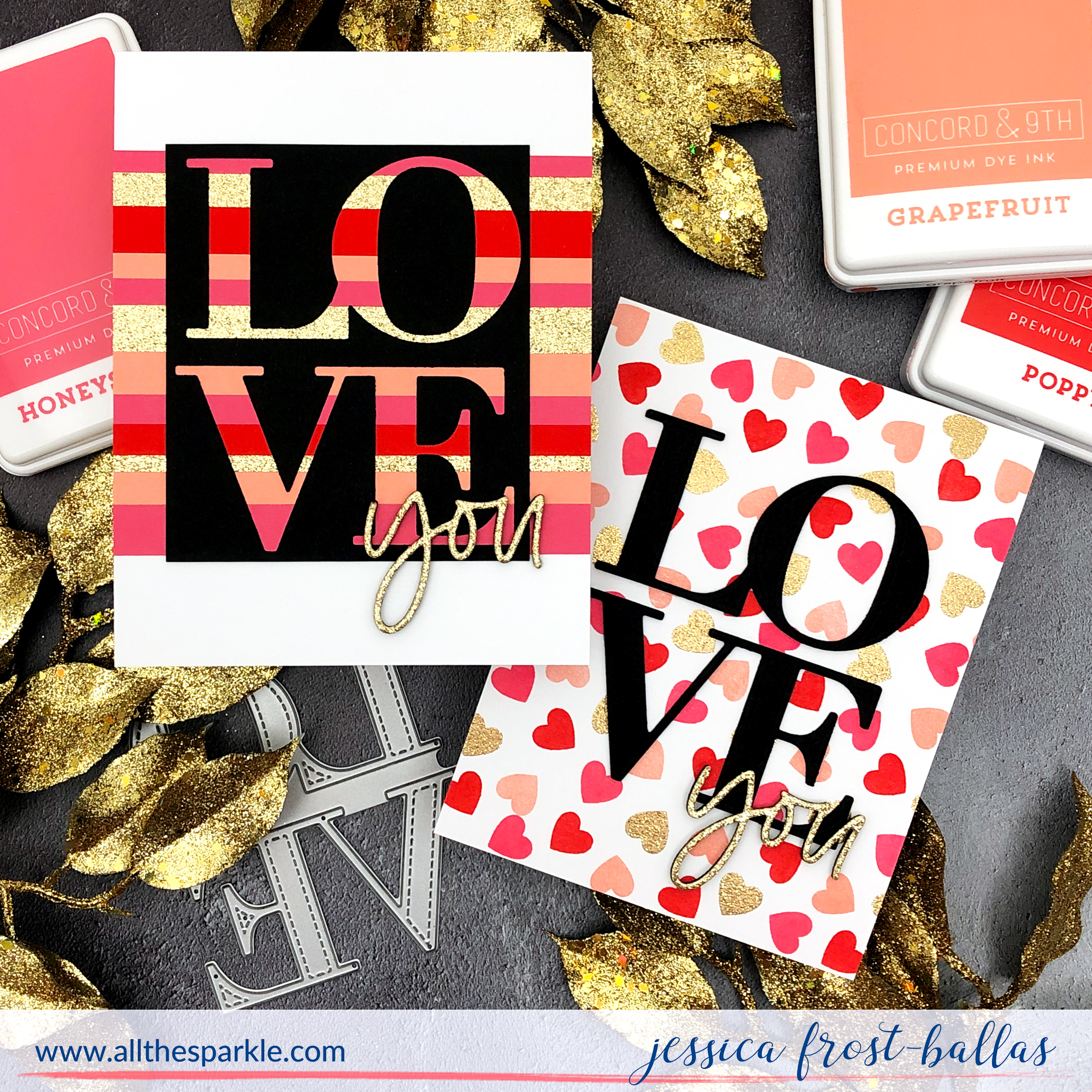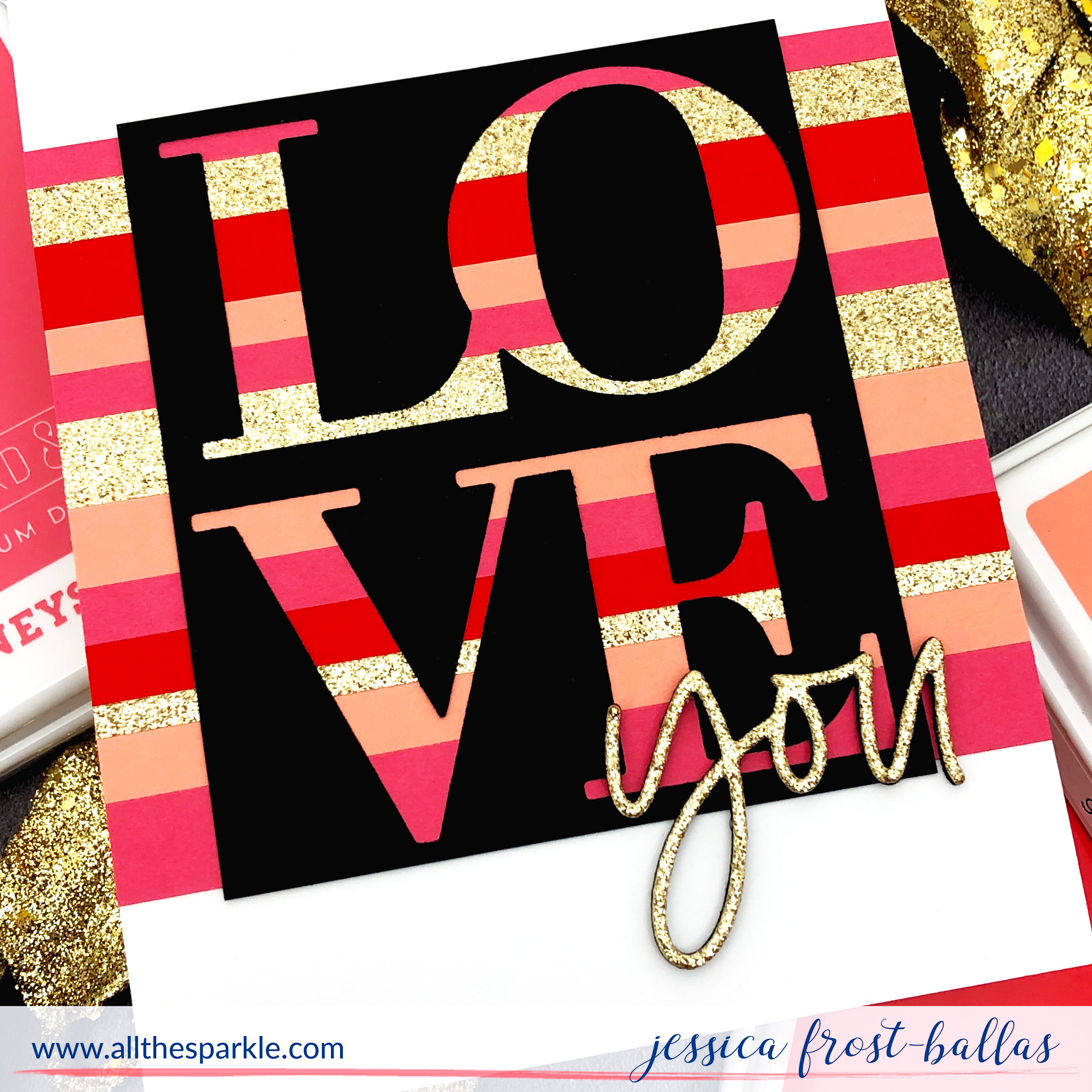 For my first card I stamped the new Scattered Hearts turnabout stamp with Grapefruit, Honeysuckle, and Poppy ink. I let the ink dry and then stamped the fourth turn with versamark and heat-embossed it with gold tinsel embossing powder. Then I die-cut the ‘Love’ and ‘You’ from the All the Love dies with black cardstock three times and the ‘You’ once from gold glitter cardstock. I adhered them together to create dimensional sentiments and then adhered them to the card. Super simple but perfect for Valentine’s Day!