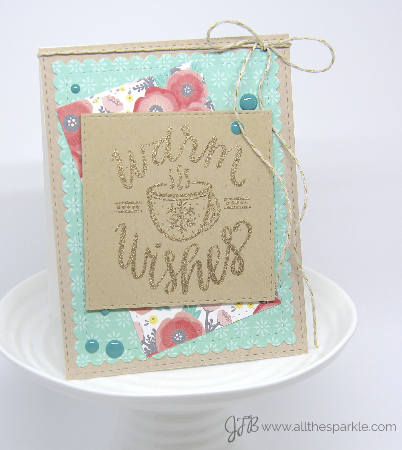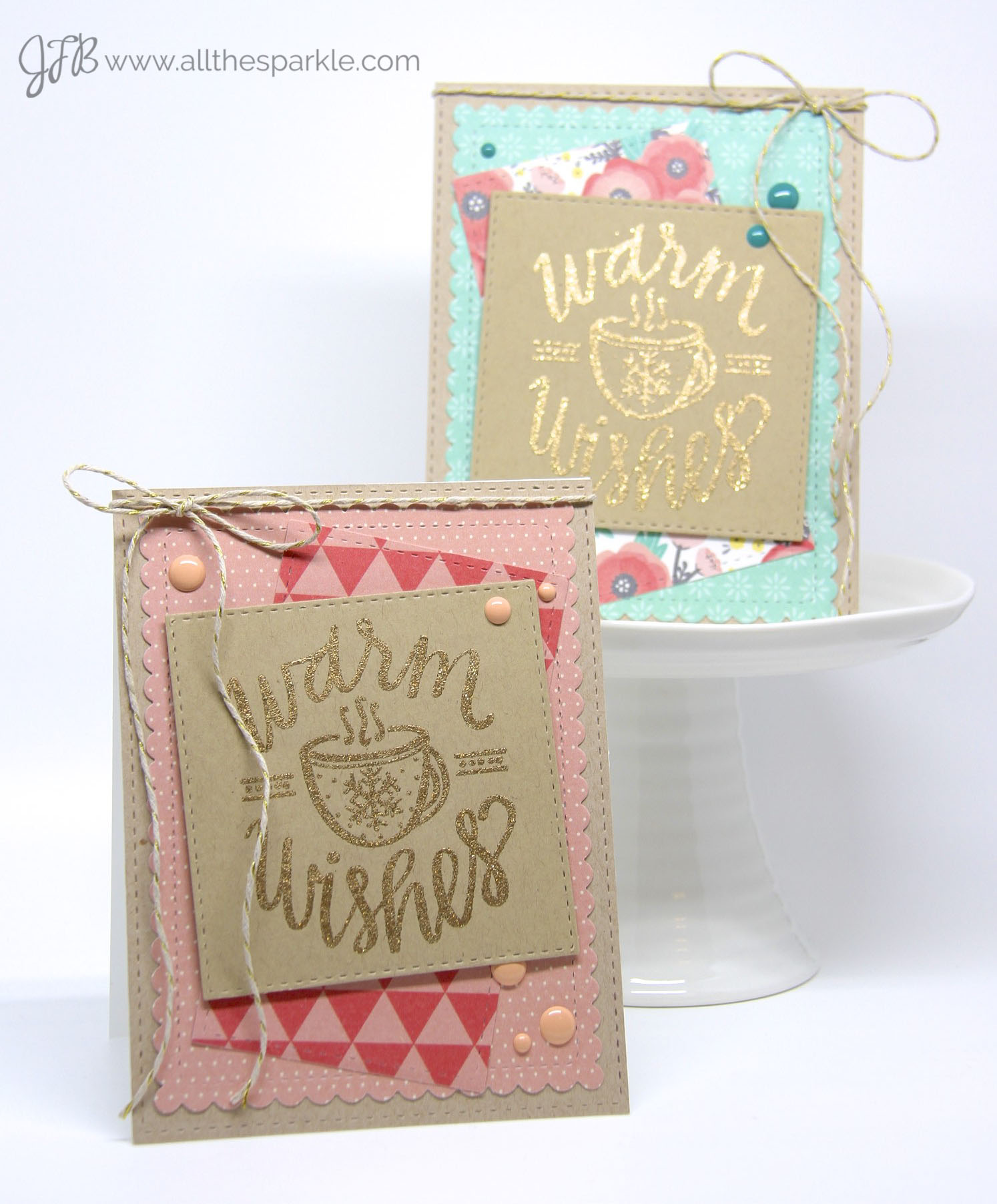 I recently picked up this cute Neat and Tangled stamp and wanted to make a fairly simple card using it as the focus! I’m not usually big into layers but thought this would be a fun way to play with patterns and textures! I used a scalloped edge die and stitched rectangle dies to cut all the patterned paper and kraft cardstock. I heat-embossed the sentiment with gold tinsel embossing powder and popped it up with foam mounting tape for a little extra sparkle and dimension! Finally I added a little kraft and gold twine and enamel dots! I tend to hoard patterned paper and this was a great way to actually use some of my stash! Here’s a closer look at each card…one is more teal and floral: