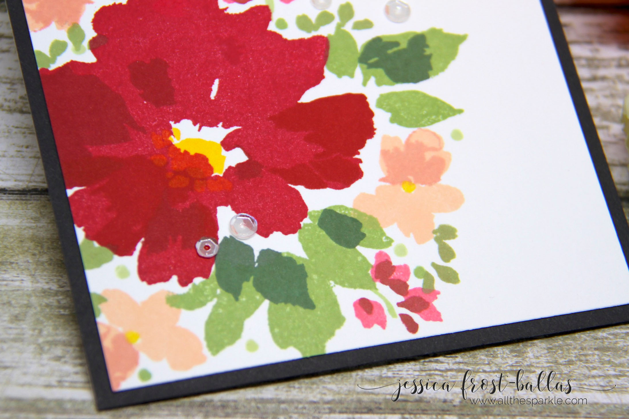I really like this stamp set because you don’t have to line up the layers perfectly to get a gorgeous look. I used some of the tinier stamps in the set to fill in some of the gaps around the larger flowers and greenery. I stamped the sentiment in jet black ink and then added a few Onyx black sequins to finish the card.