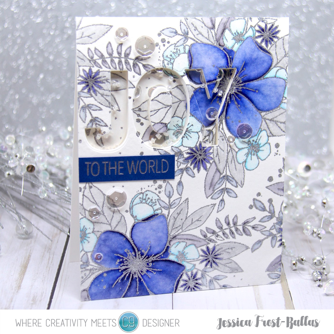 Next I die-cut the word ‘Joy’ from the upper left part of the panel and backed it with acetate. I added a double layer of foam mounting tape around the word and filled it with sparkling clear sequins and white, silver, and clear beads. I sealed up the shaker and finished my card by adding the rest of the sentiment heat-embossed onto dark blue cardstock with silver embossing powder.